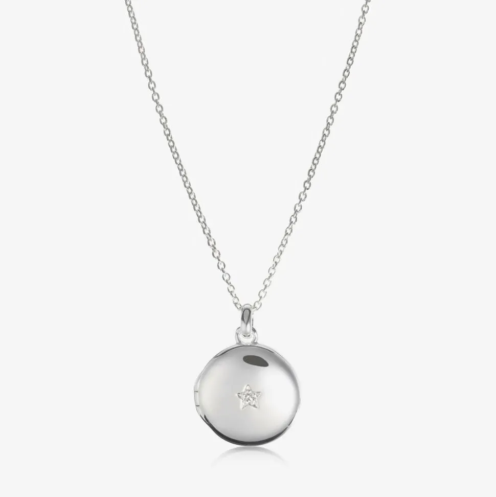 A charming sterling silver necklace and locket for boys and girls by Little Star, with an exquisite diamond set within a dainty star. A thoughtful gift for a special little one, the locket can be engraved for that personal touch and opens to allow two small photographs to be secured inside. The delicate chain has a clasp fastening and can be worn at different lengths. This timeless piece comes beautifully presented in a fabric pouch, box and gift bag.