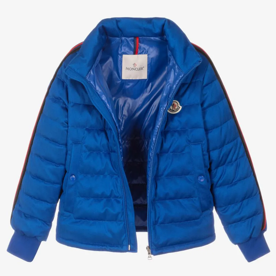Blue puffer jacket for teen boys by luxury French brand Moncler Enfant, made in smooth knitted fabric. Lightly padded with down for cooler climates, it has a smooth, shiny lining and red and black striped trims on each sleeve. This stylish jacket fastens with a zip on the front, with a logo branded pull and there are popper fastening pockets.