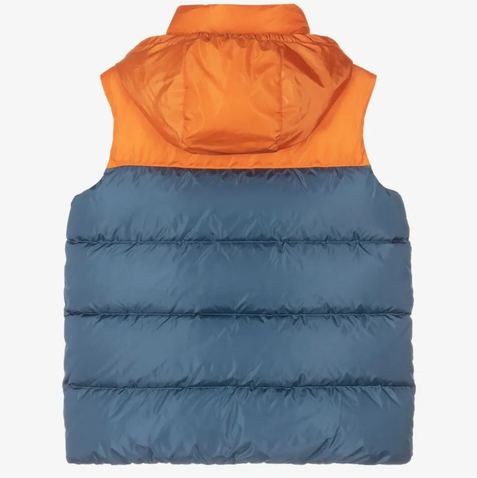 Designed by luxury Italian brand Gucci, this orange and blue puffer gilet is for teen boys. For an instantly recognisable designer look, it has an Interlocking G Web logo patch and signature Web stripe trim in navy blue and red across the chest. Silky smooth and down-padded or extra warmth, it has an elasticated hemline and a logo popper-fastening storm flap over the front zip, to help keep out chilly winds. The style is complete with an attached hood that folds away neatly inside the collar and useful front pockets.