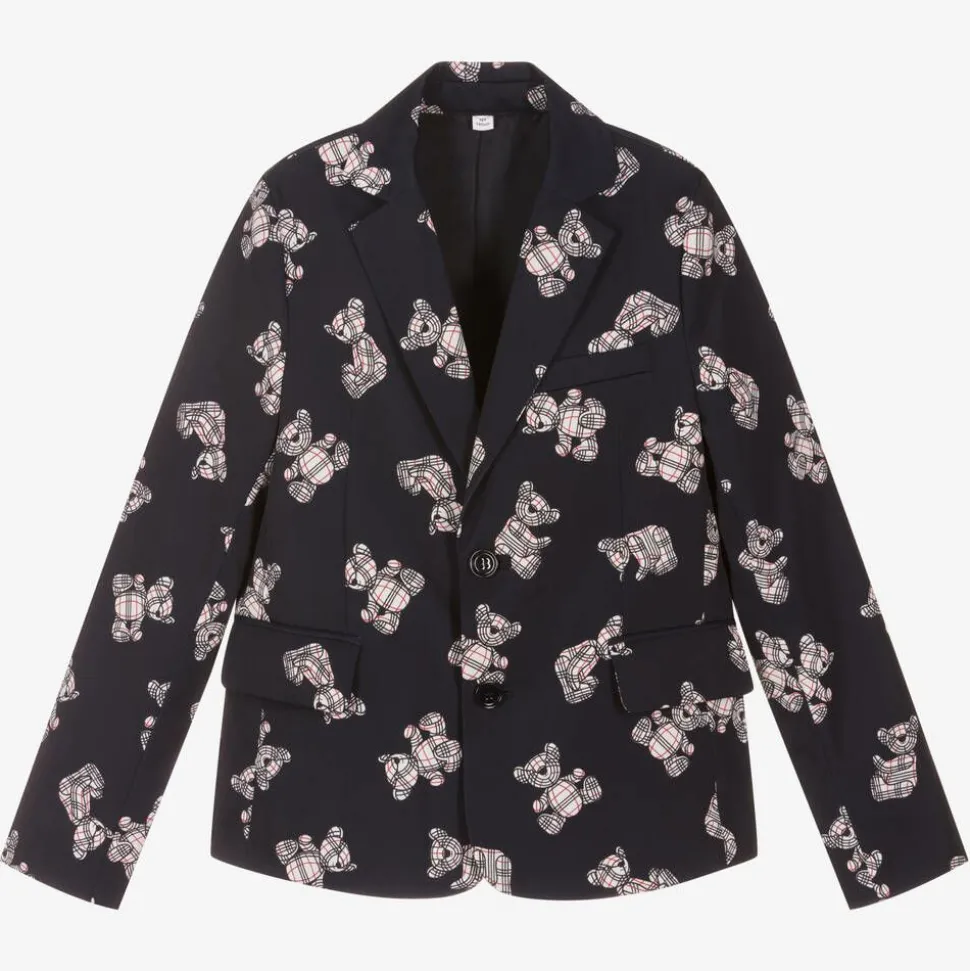 Midnight blue blazer for teen boys from British brand Burberry, patterned all over with the designer's Thomas Bear in red, white and blue for statement style. This smart tailored jacket is made from mid-weight polyester twill with a luxurious feel and is lined in satin with a logo jacquard weave. Single breasted with a vent on the back, it has a chest pocket, front flap pockets and useful interior pockets.