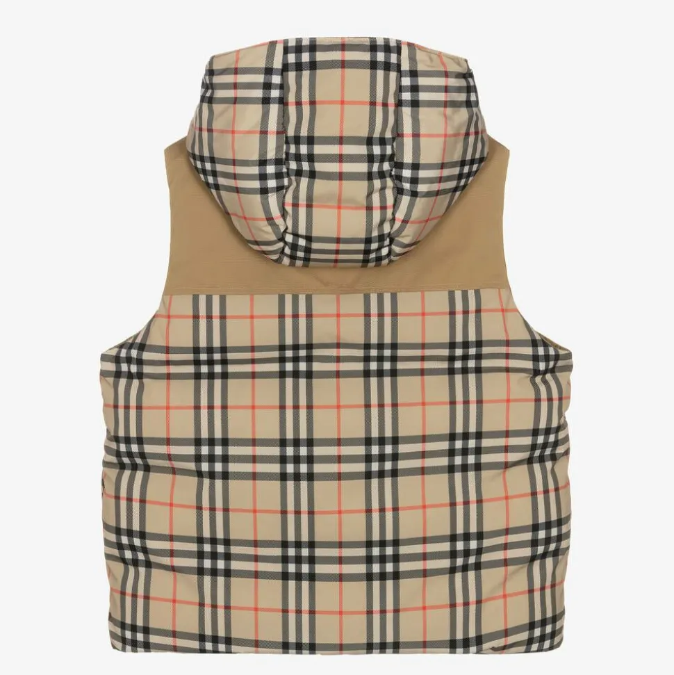 Archive beige puffer gilet for teen boys from British designer Burberry. Reversible to switch up his look, both sides are made in silky-smooth fabric, and padded with luxurious down for supreme warmth. One side is plain beige, with the British label's Horseferry logo patch on the front and the iconic Vintage check pattern on the hood lining. The reverse is designed with beige canvas and silky Vintage check panels for a cool multi-textural finish. Both sides have popper-fastening pockets and a gold branded zip closure.
