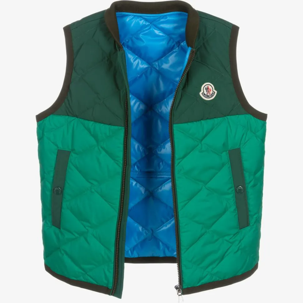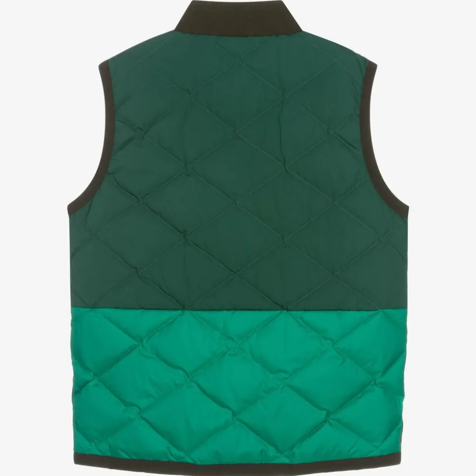 Diamond quilted gilet for teen boys by luxury French brand Moncler Enfant, in a two-tone green colourblock. For an unmistakable signature look, the iconic felt logo patch can be seen on the chest. Silky smooth with an extra shade of green on the trim, it is padded with lightweight down for warmth on cooler days. There are popper fastening front pockets, a ribbed collar and the gilet fastens with an exposed zip down the front.