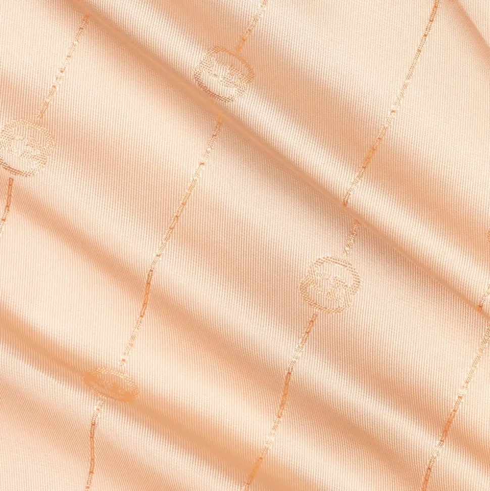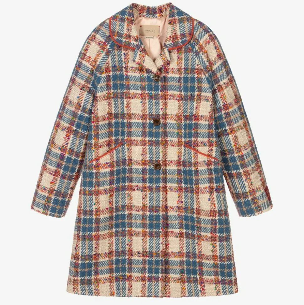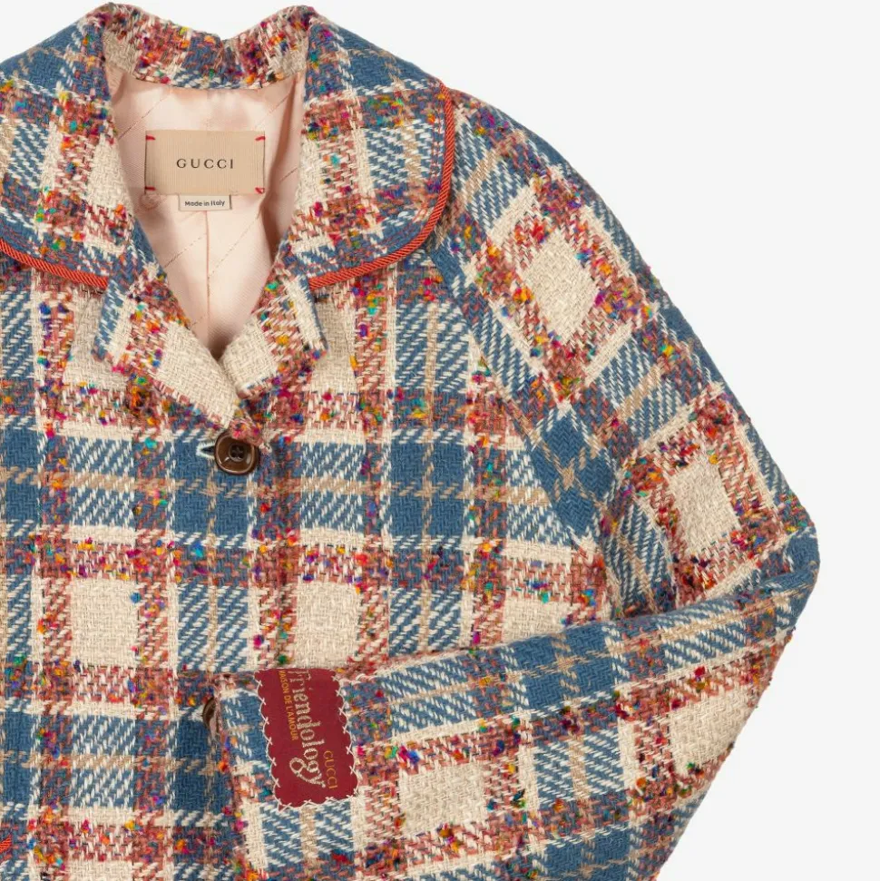 Stunning beige coat for teen girls by iconic Italian brand Gucci, made in a cotton wool blend. There are retro piped orange trims, two front pockets and a red 'Friendology' patch on one sleeve. The luxurious silky peach pink lining is patterned in a diagonal Interlocking G jacquard. It has a premium vintage feel, with delicate woven details consisting of a blue check and colourful threading.