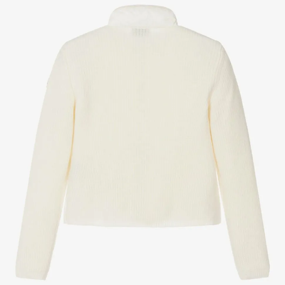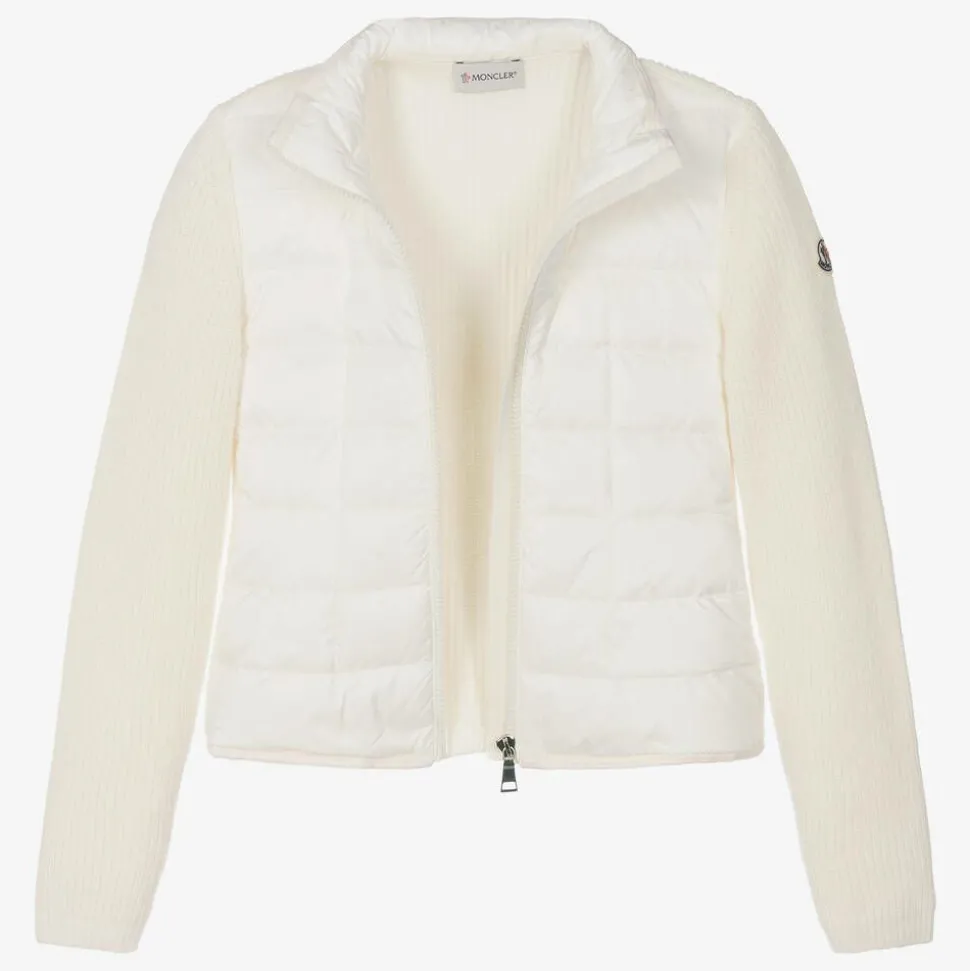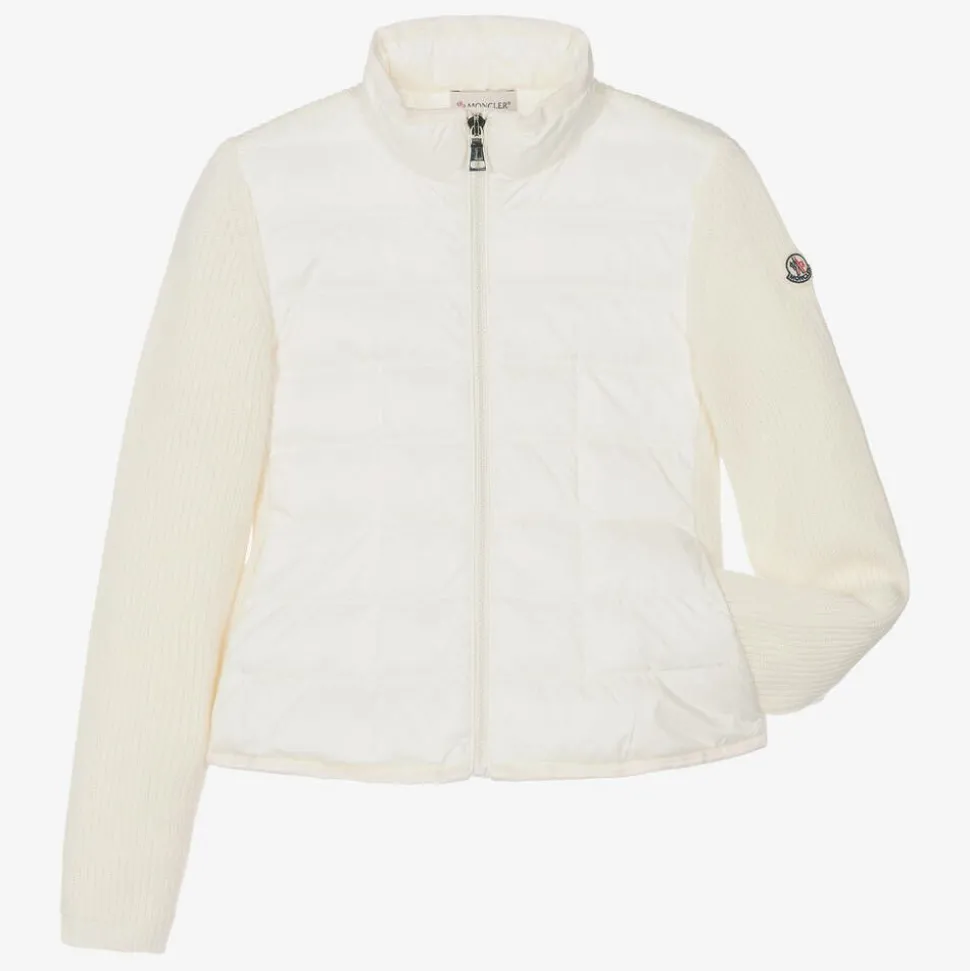 Teen girls ivory jacket by luxury designer Moncler Enfant, with the signature logo patch on the sleeve. In a feminine A-line silhouette, it is knitted from luxuriously soft wool on the sleeves and back, with a silky, down-filled front puffer panel. It fastens neatly on the front with a zip, has useful side pockets and complementary pink trims on the stand-up collar and hem.