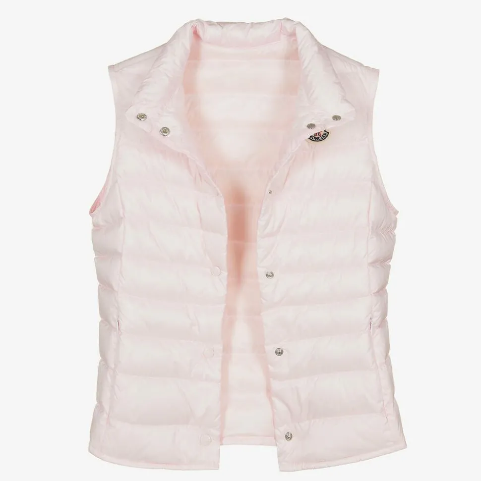 From luxury brand Moncler Enfant, a stylish pale pink puffer gilet for teen girls. Instantly recognisable, the iconic felt logo patch can be seen on the chest. Silky smooth and lightweight, this sleeveless jacket is made in the brand's signature water-repellent longue saison and padded in soft down for warmth without the weight. Fastening with branded poppers on the front, it has concealed zipped front pockets, and a gently fitted, feminine silhouette. It comes with a branded, pack-away pouch.