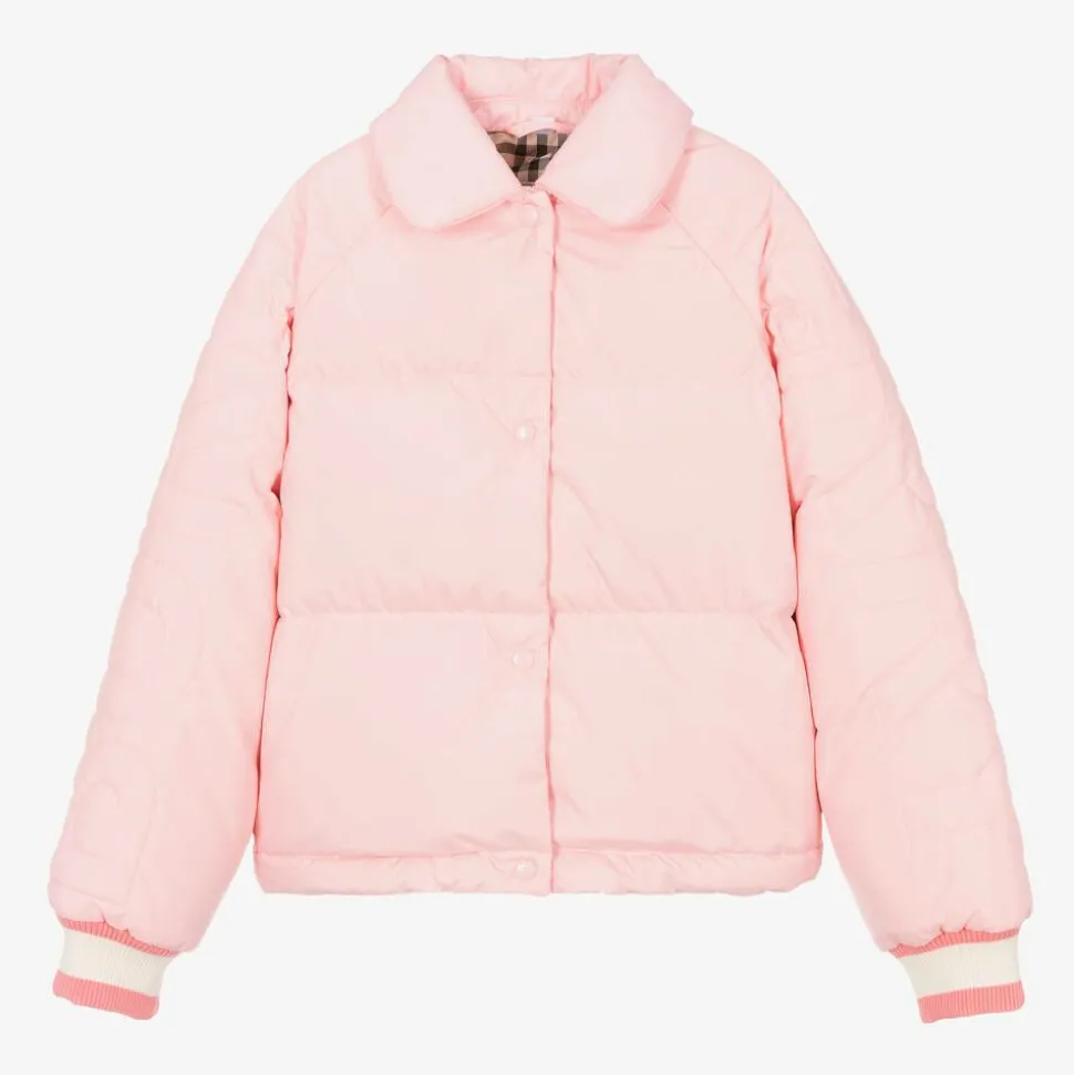 Pink puffer jacket for teen girls by luxury British brand Burberry, with logo lettering stitched across the top of both sleeves for a discreet designer statement. It has a silky smooth lining patterned with the brand's iconic Vintage check and is down padded for warmth. There is a rounded collar, concealed popper-fastening side seam pockets and branded popper fastenings on the front. Made in soft smooth fabric, it has ribbed pink and ivory striped cuffs for extra cosiness.This item contains at least 70% recycled material.