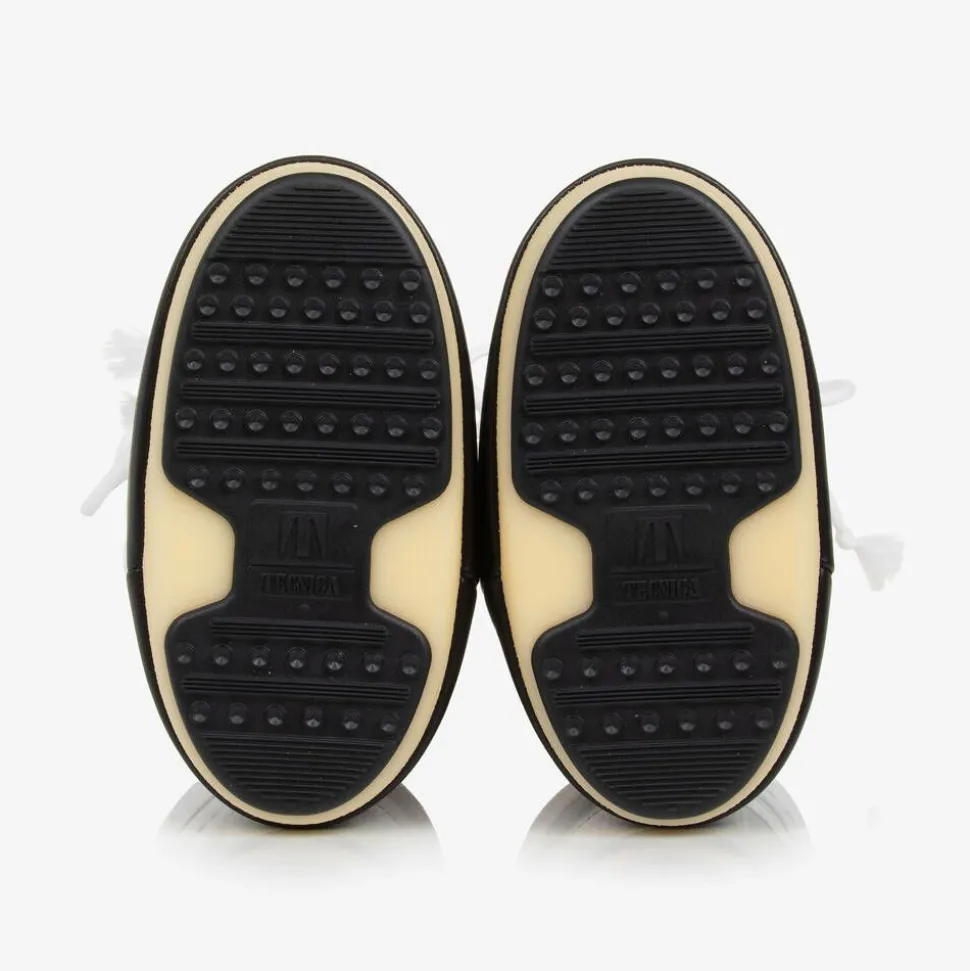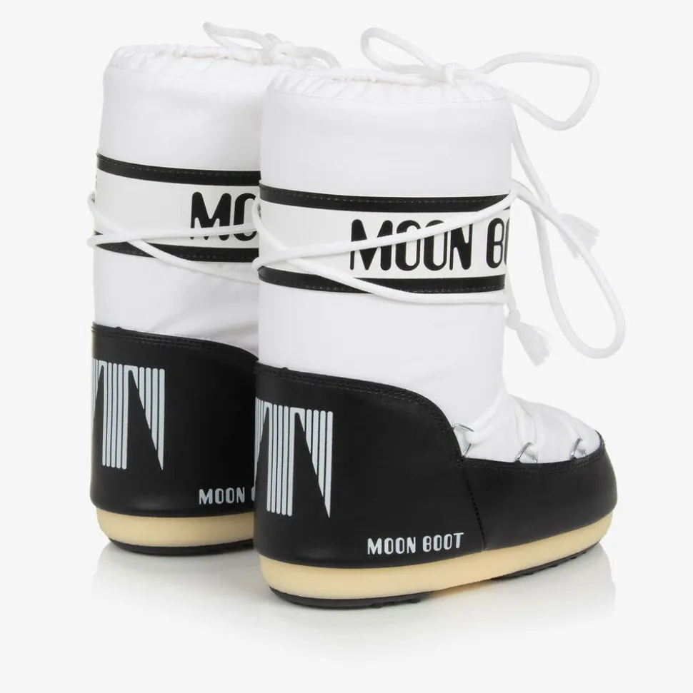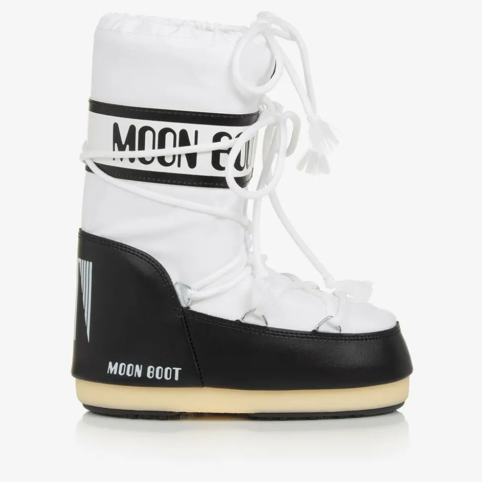 Stylish white and black long snow boots for boys and girls by Italian brand Moon Boot. Designed in the signature original style with bold black logo prints, they are heavily padded and ultra resistant, with faux leather trims and decorative laces. There is a drawstring tie on the cuffs ensuring a warm and comfortable fit and the thermoplastic non-slip rubber sole features tiny suction cups for improved grip on slippery surfaces. The technological foam lining will feel snug at first but will mould to the size and shape of the foot after a few hours of wear.