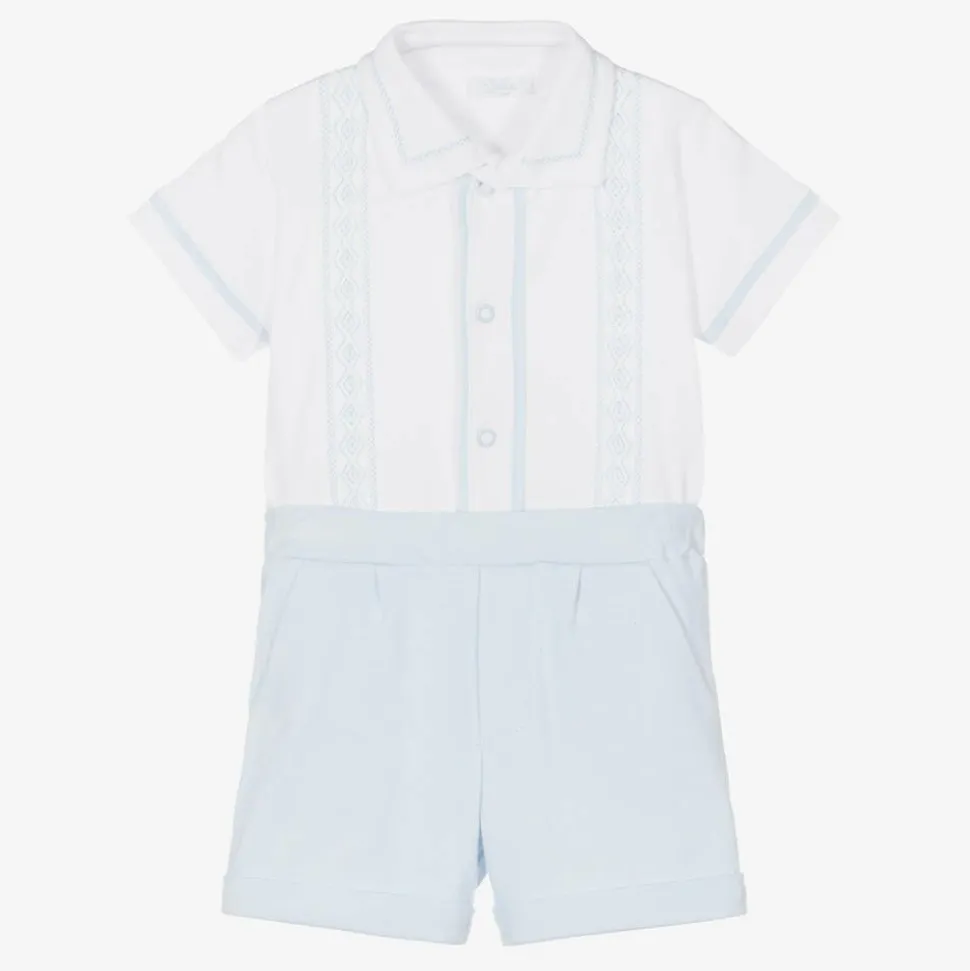 White and pale blue shorts set for baby boys by Sofija, made in soft and stretchy cotton jersey. Exclusive to Childrensalon, the white bodyvest has beautiful blue embroidery with pale blue trims. The blue jersey shorts have turned up cuffs and an elasticated waist for a comfortable fit.