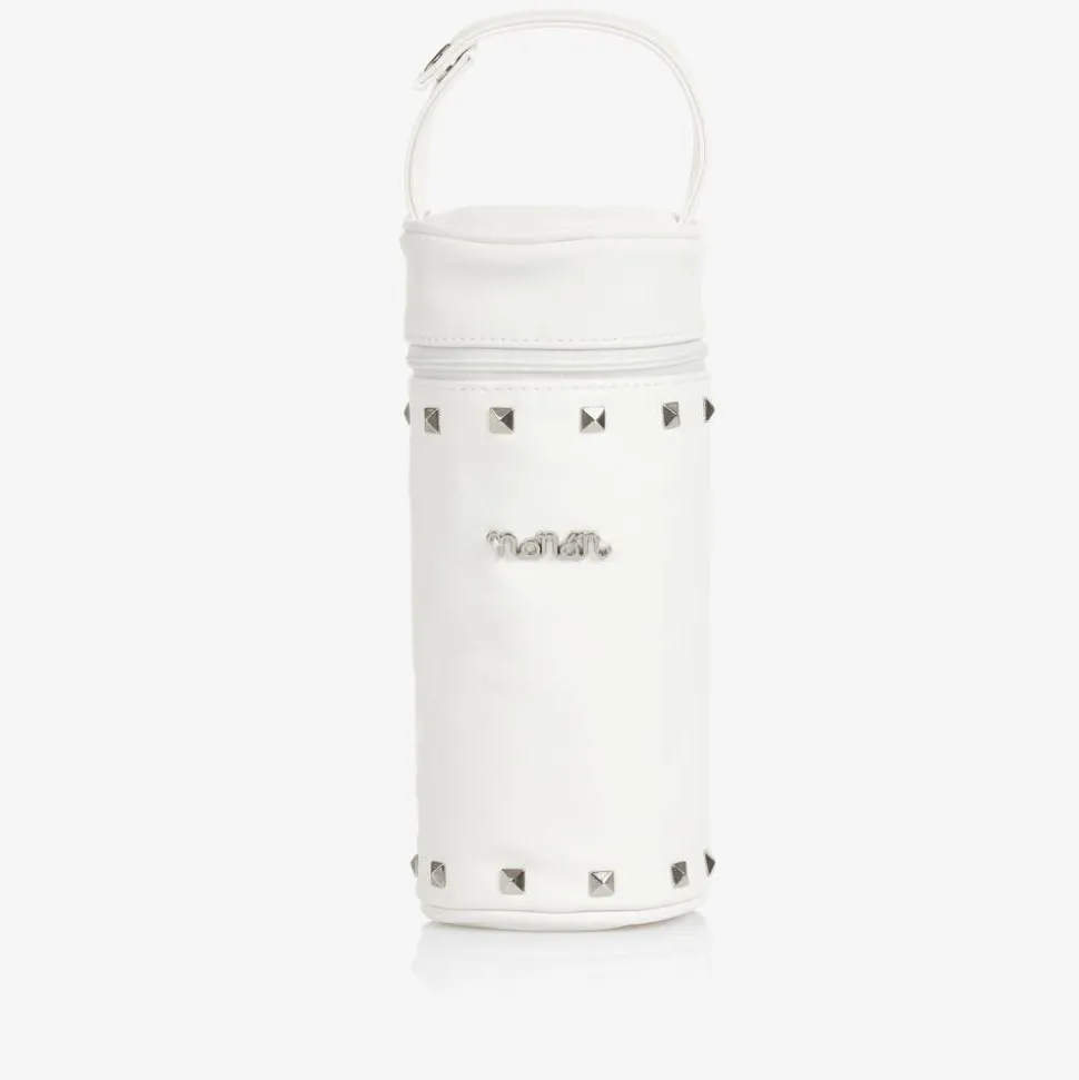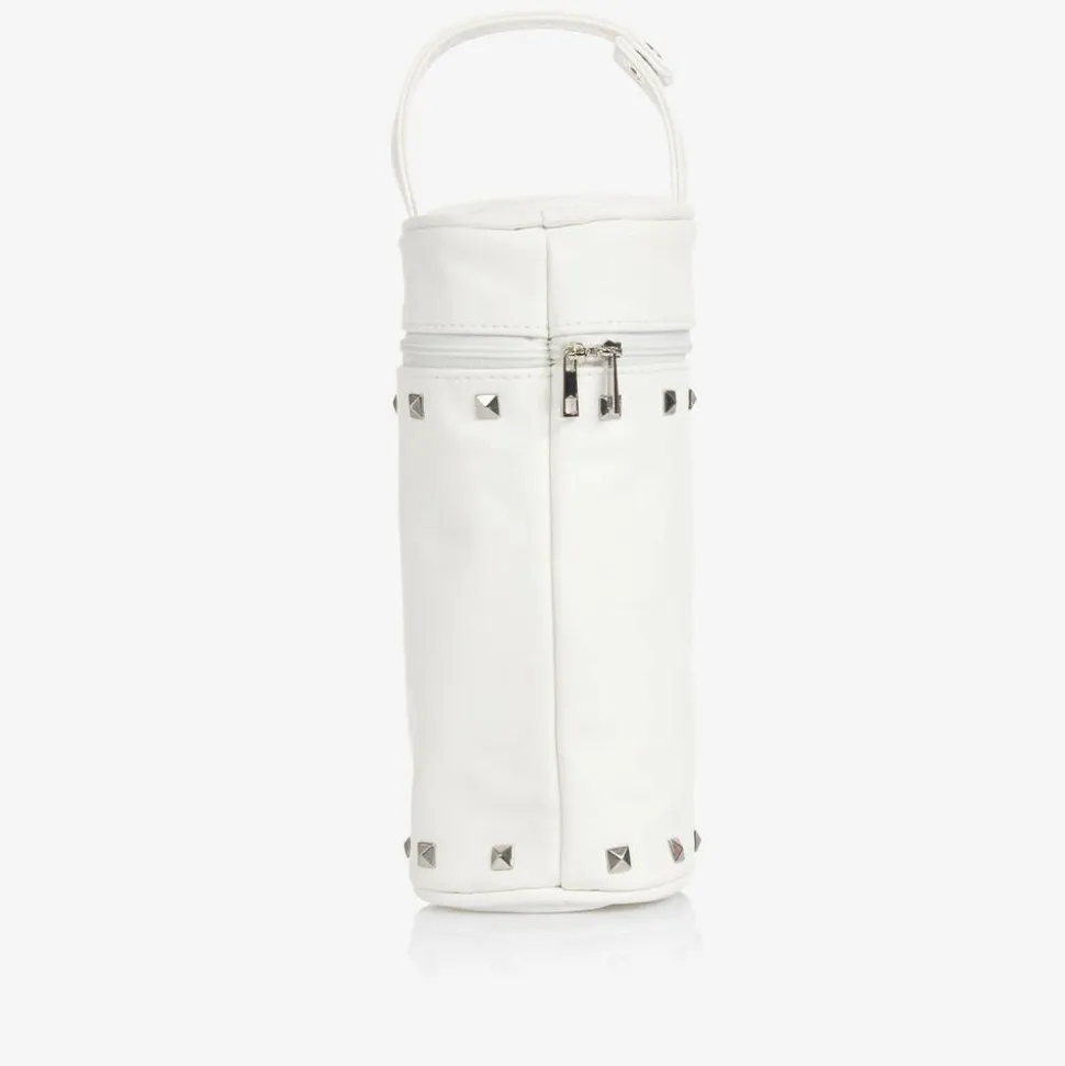 Stylish white bottle bag for baby boys and girls by Italian brand, NanĂ¡n. The wipe-clean outer surface has a textured pattern, gold metal studs for a luxurious finish and a gold metal logo. Lined in logo jacquard satin, the bag has a popper-fastening carry handle and double zip-fastening closure.