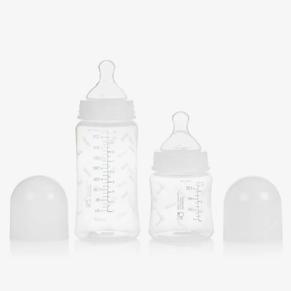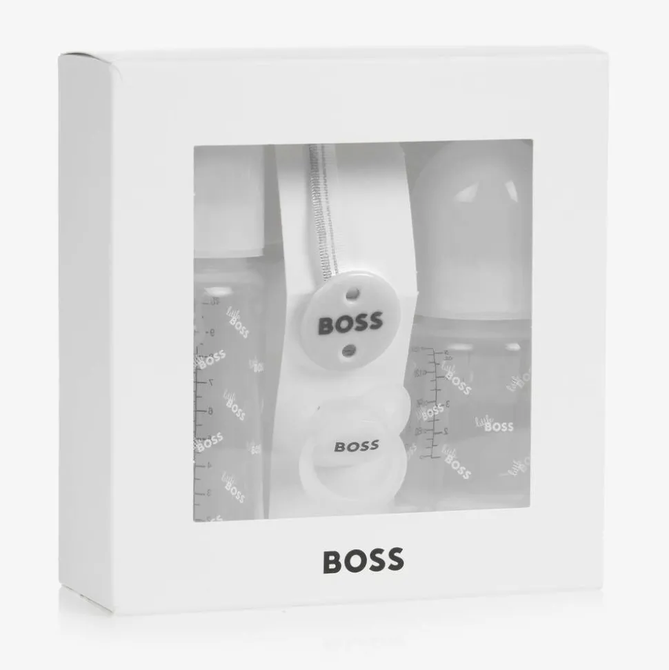White bottle and dummy set for baby boys and girls, by BOSS. The lovely gift set includes two baby bottles, a white logo dummy and a silver striped dummy clip. Both the large and the smaller feeding bottles have a silicone teat, a screw cap to prevent leakages and 'Little Boss' logo branding.