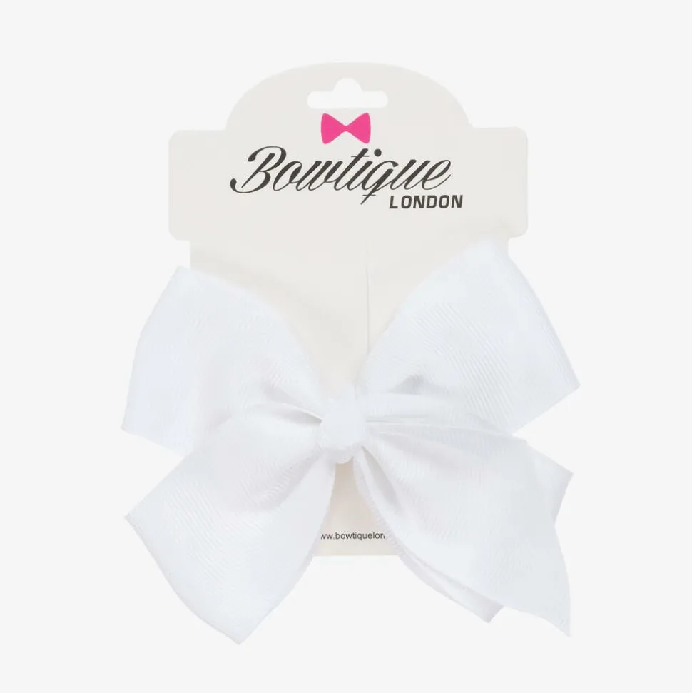 A white hair clip for girls by Bowtique London, lovely to accessorise an outfit. The bow is handmade in delicate grosgrain ribbon and set on a slide-in metal clip.