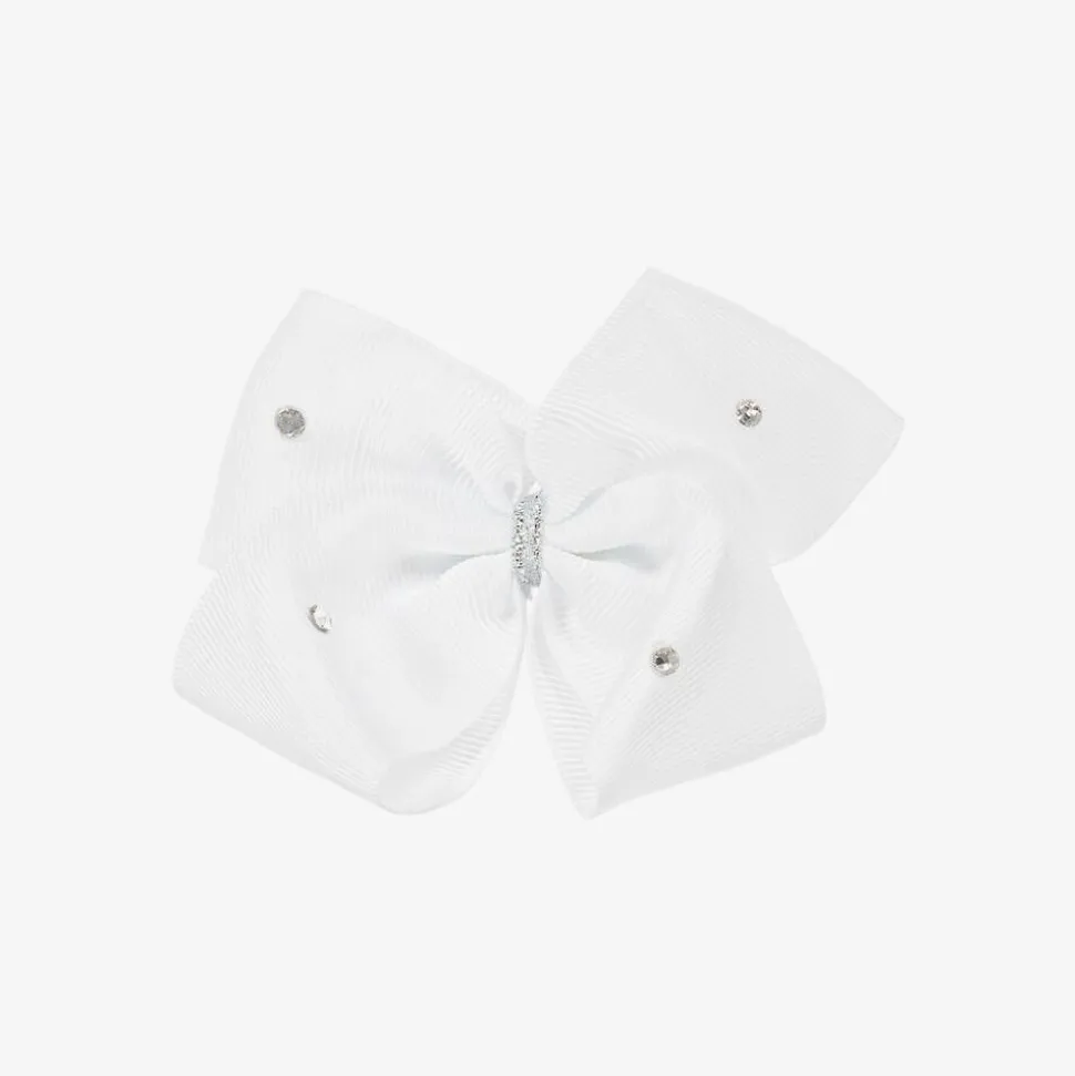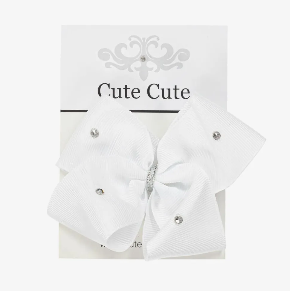 A white grosgrain ribbon hair clip by Cute Cute. Lovingly handmade, this pretty hair accessory is studded with sparkling diamanté to add a touch of glamour to an outfit. It secures to the hair with a metal clip.