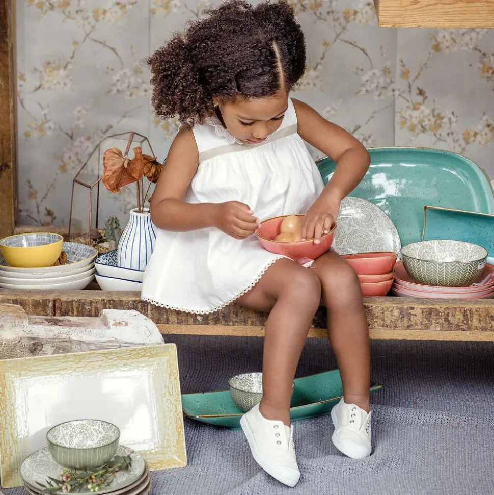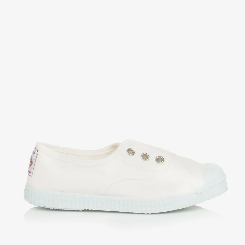 White canvas trainers for boys and girls from Pisamonas, with reinforced toe-caps for durability. These slip-on shoes have elasticated inner panels for quick and easy dressing. The rubber soles are treaded for safety, the front is designed with eyelets for that classic look, and the Spanish label's cute monkey logo patch is stitched on the back.