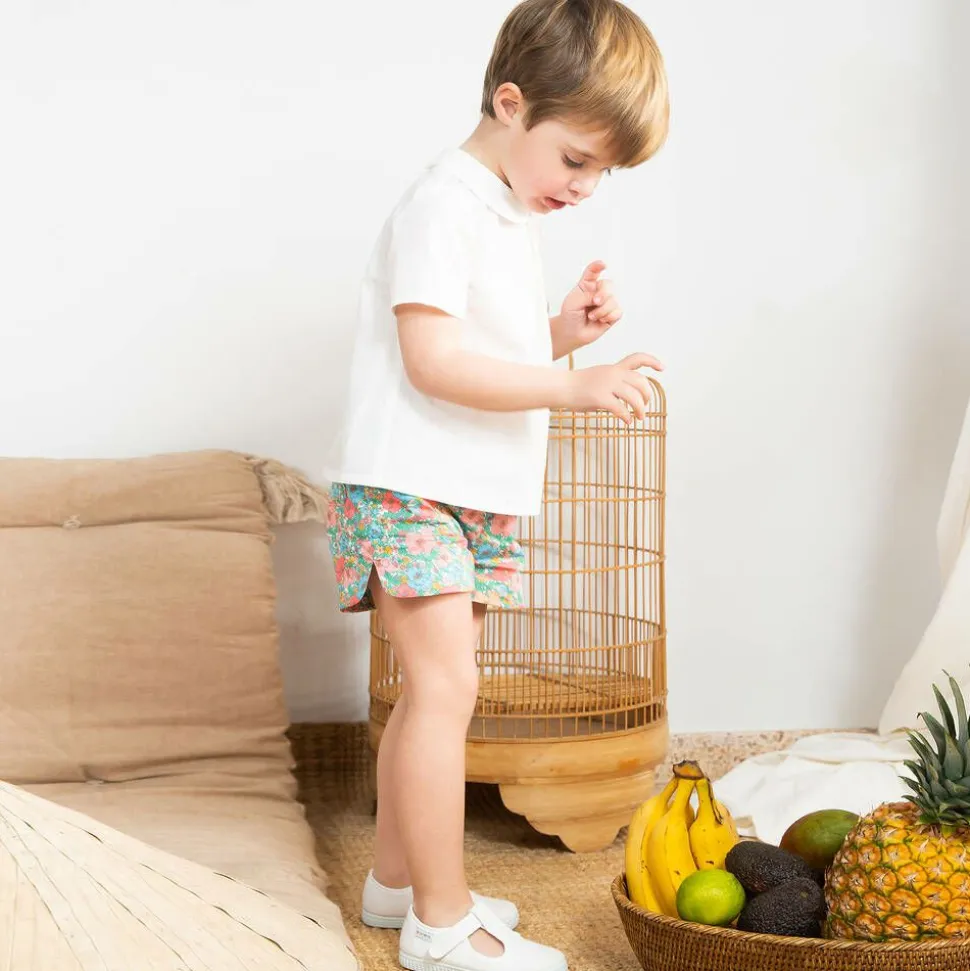 White T-bar shoes for little boys and girls by Pisamonas. Lined in soft gingham print canvas, these casual shoes have a rubberised outer sole for improved grip, and fasten simply with a velcro strap across the foot. The designer's colourful logo badge is stitched on the side of one foot, completing the style with subtle branding.