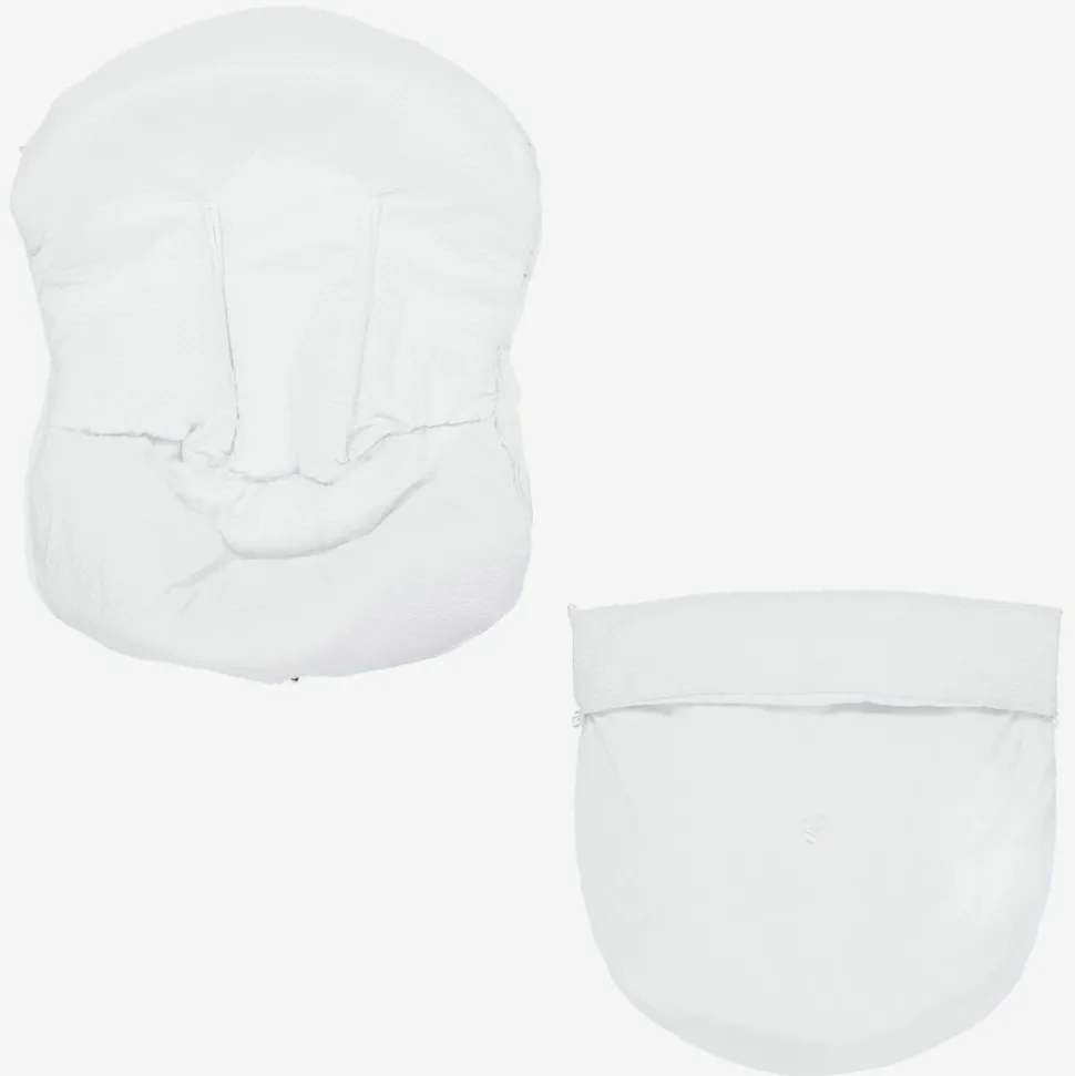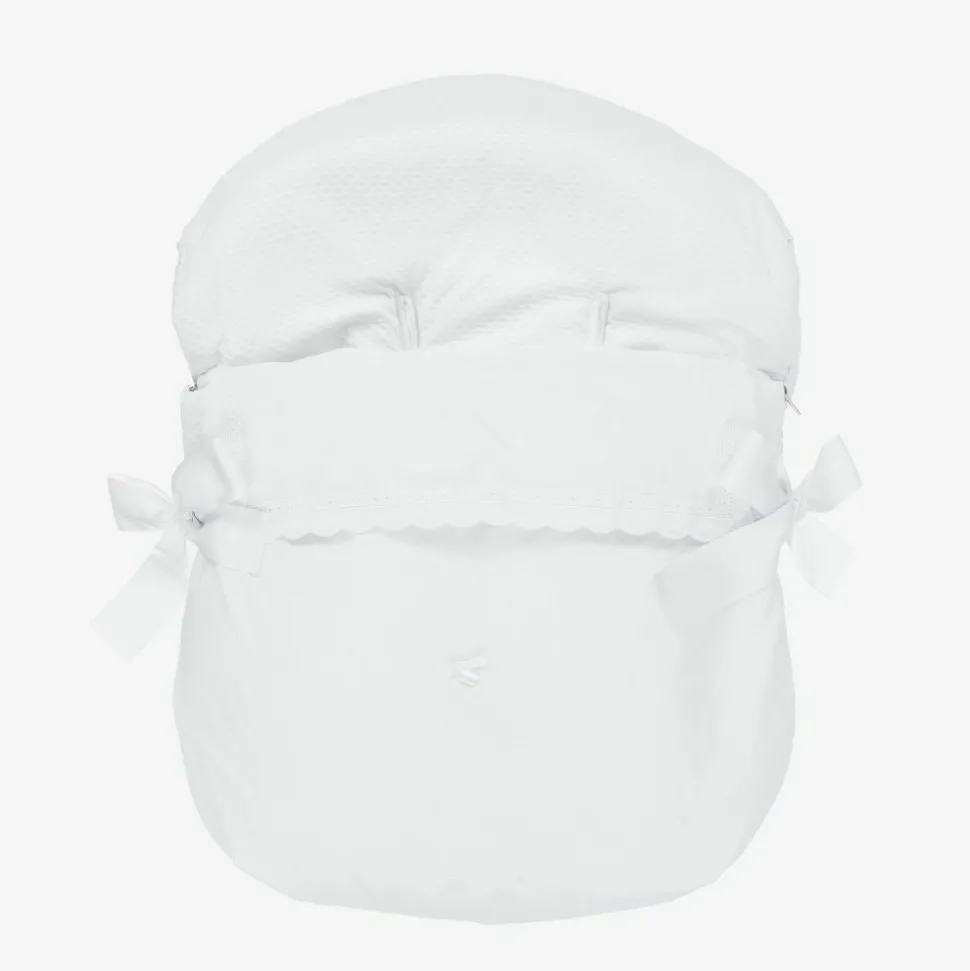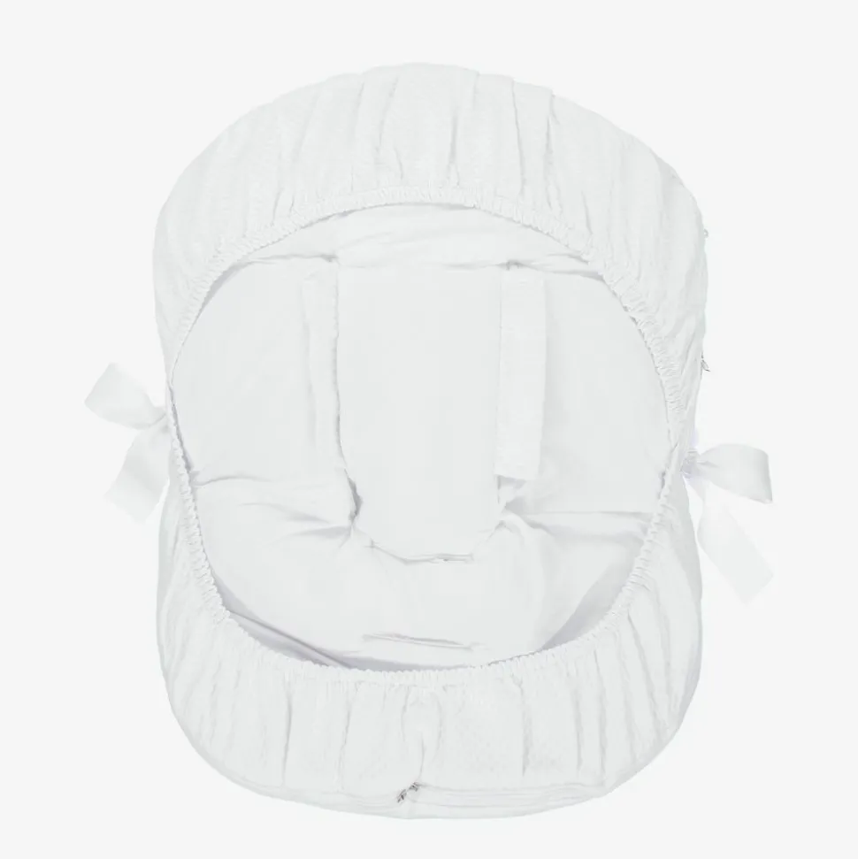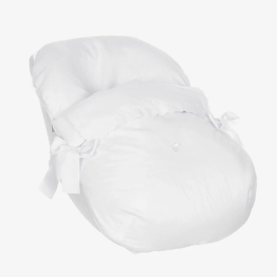 Padded white baby nest by Uzturre, ideal for use in the car seat. It has a sweet embroidered dots on the front, and tie-up white grosgrain ribbons on the sides. With a pretty decorative lace flap, the front has zip fastenings on both sides for easy access. The backing hooks over the car seat and it has velcro fastening holes for shoulder straps.