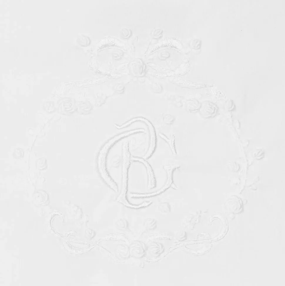Exclusive to Childrensalon, a white cotton babygrow and bib set for boys and girls by British heritage brand Beatrice & George. The soft, comfortable jersey babygrow has a sweet poplin ruffle around the neckline that extends down one leg. The ruffle covers the popper fastenings, which make dressing and nappy changes quick and easy. It comes with a poplin bib that has a beautiful, hand-embroidered monogram logo on the front, surrounded with flowers. It is fully lined and fastens with a popper around the back.