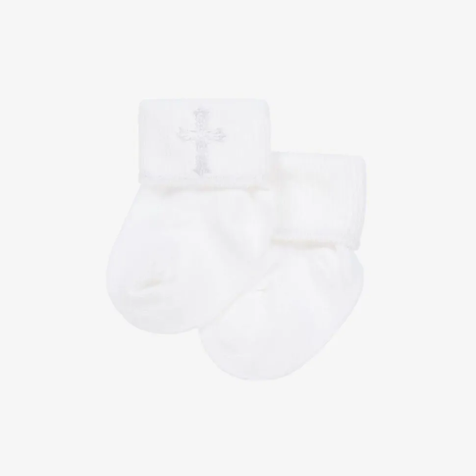 Gorgeous little white socks for baby boys and girls by Country Kids, made from a soft and stretchy cotton blend knit. An ideal Christening accessory, they are embroidered with religious symbols on the cuffs.