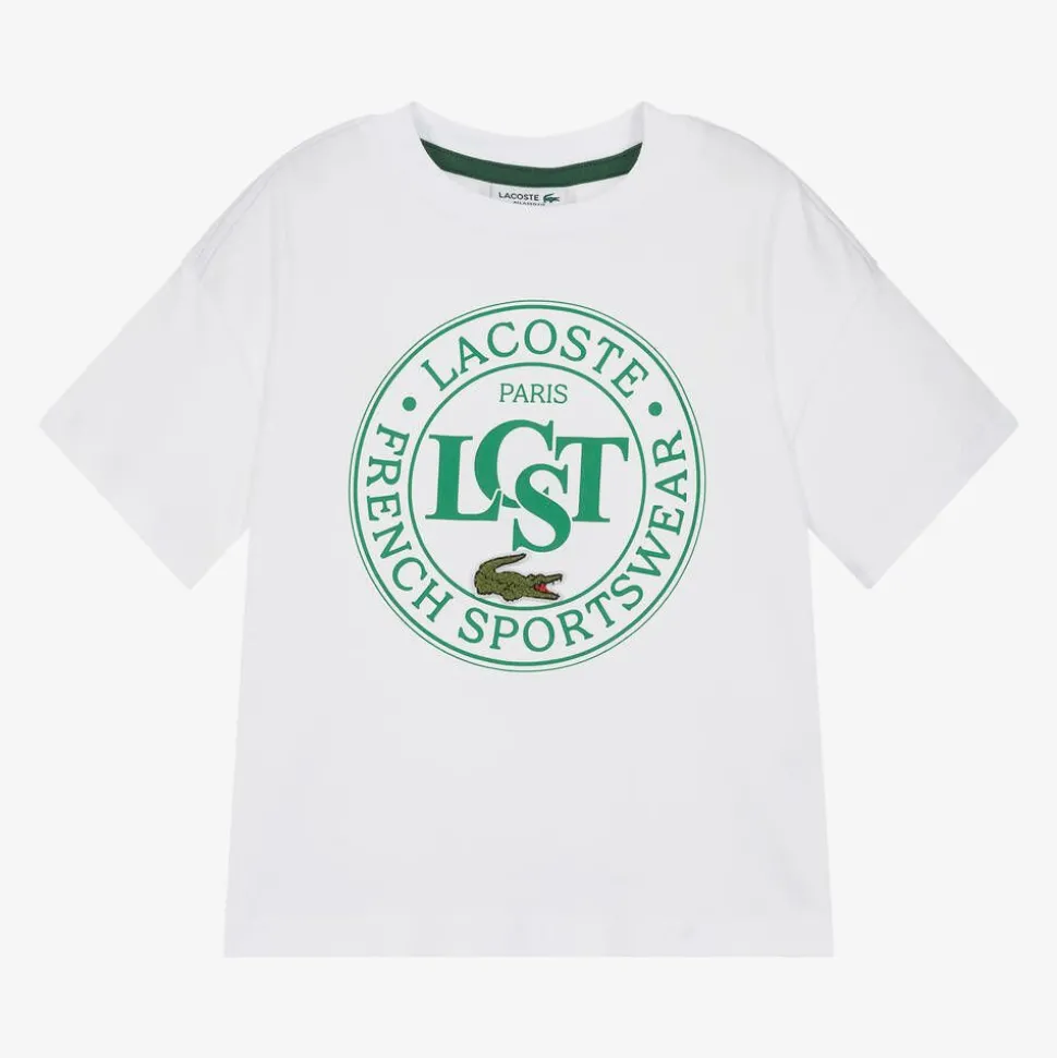 A white organic cotton T-shirt for boys and girls by Lacoste, made in comfortable jersey. A relaxed fit with short sleeves. it has a bold green circular logo print on the front, with the iconic crocodile badge for instant branded appeal.