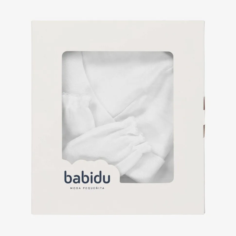 White two piece hat and mittens set by Babidu, for baby boys and girls. The hat is made in a double layer of stretchy cotton jersey with a turned-up brim. The matching scratch mittens are elasticated on the cuffs with delicate scalloped trim.