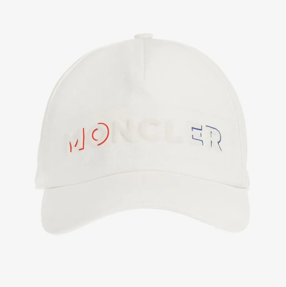 Designed by Moncler Enfant for boys and girls, a white cotton cap with an embossed tricolour logo on the front. Made in soft cotton twill with a large peak, this casual cap has an adjustable branded velcro tab on the back, for a great fit.