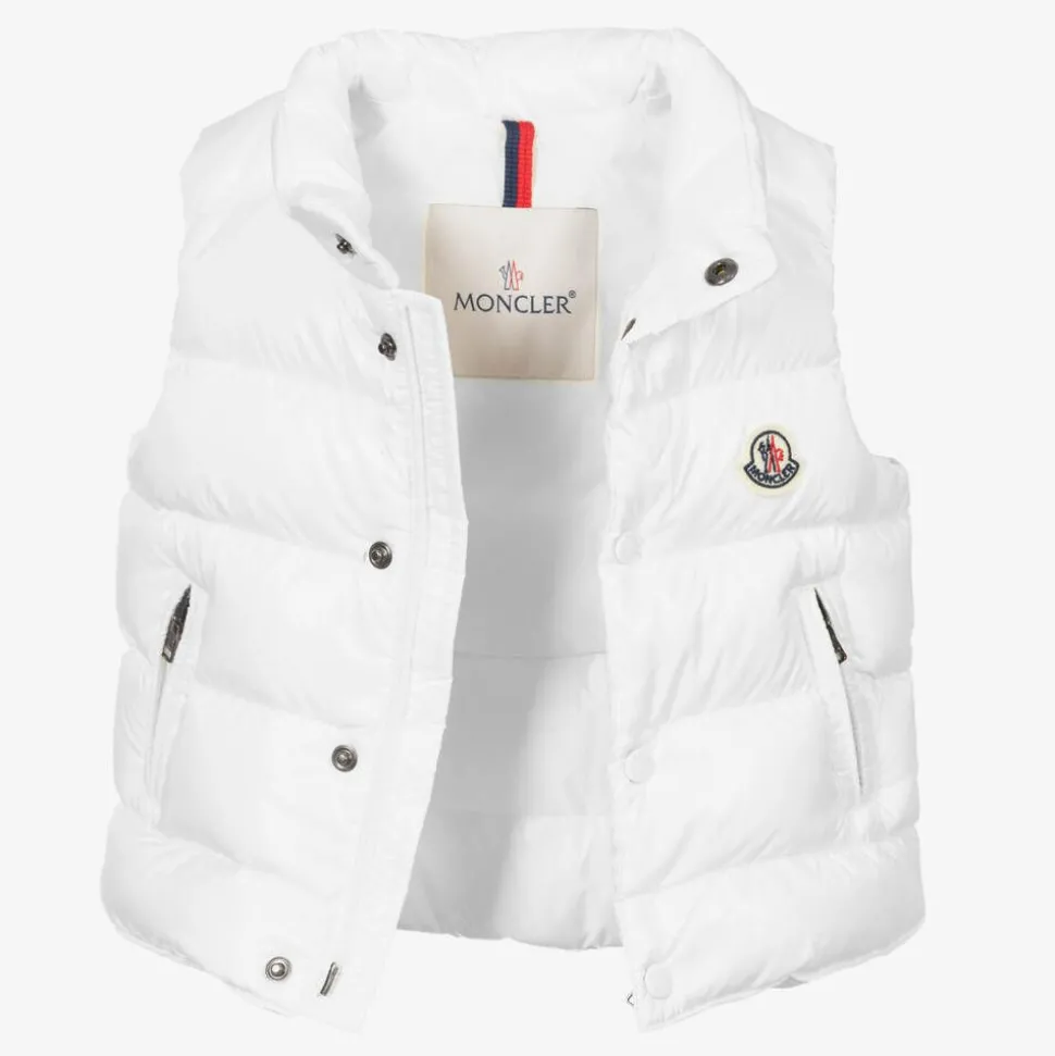An off-white gilet for little girls and boys by luxury brand Moncler Enfant. Silky smooth and water repellent, it is padded with luxuriously soft down for comfort and warmth. The front zip is secured behind a popper fastening placket for better insulation. There are zipped pockets and an embroidered logo badge on the chest.