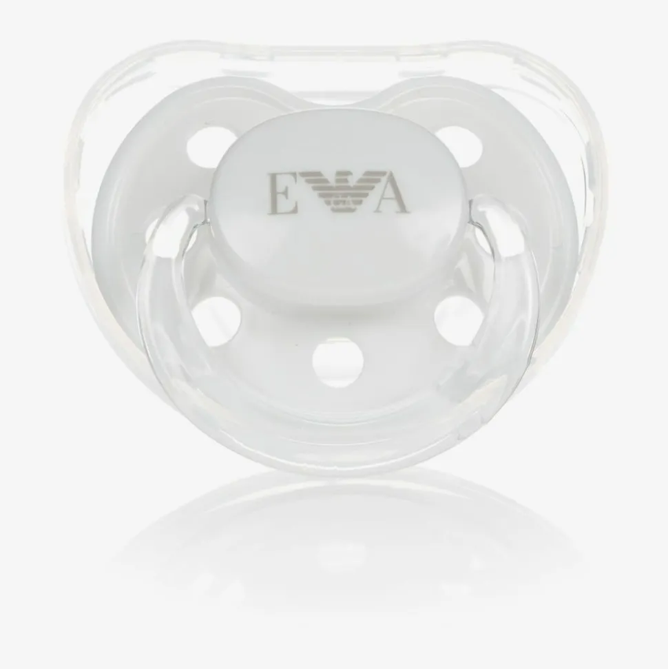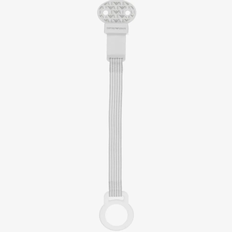 White dummy and clip set for baby boys and girls by Emporio Armani, with iconic Eagle logo branding. The dummy is made up of silicone teat in a comforting shape and has a durable plastic shield ring. The striped fabric strap fastens onto clothing with a easy-to-use clip.