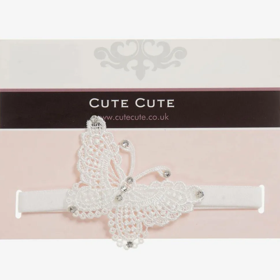 A simply beautiful white headband by Cute Cute. It has a pretty lace butterfly scattered with Swarovski crystals on a soft elasticated band.