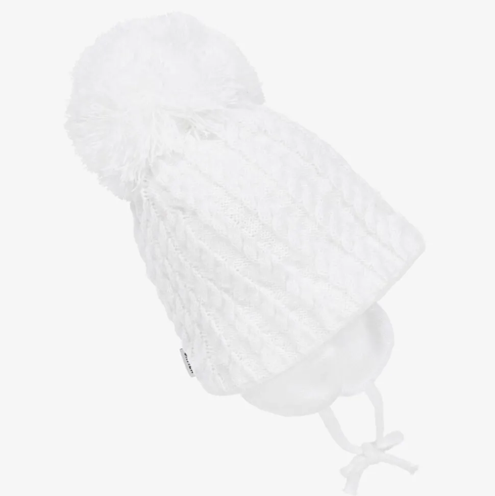 A white beanie for little boys and girls by Sätila of Sweden, in a lovely cable knit design. It has a giant pom-pom decoration and ear flaps with ties that secure under the chin to keep them super cosy. For extra comfort and warmth, the hat is lined in soft cotton jersey.