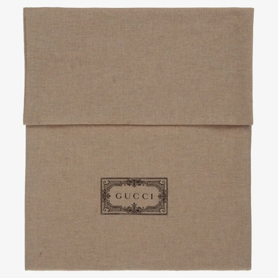 White sliders for boys and girls by luxury brand Gucci, with inspiration from the adult collection. They have a white moulded rubber sole, and an off-white leather strap with "Original Gucci" in red and green.