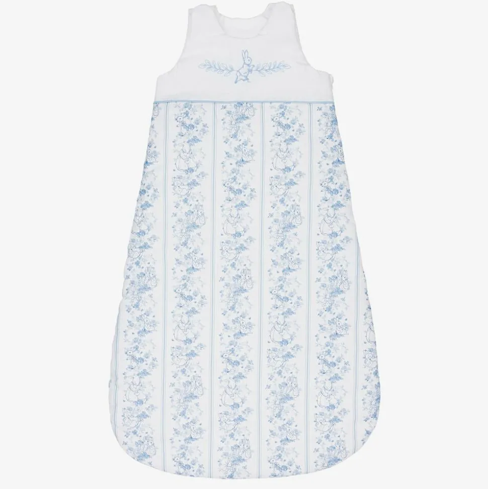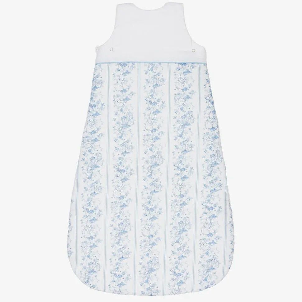 Beautiful white linen and cotton blend sleeping bag for baby boys and girls from Peter Rabbitâ„¢ by Childrensalon. It has beautiful, pale blue embroidery of original illustrations by Beatrix Potter at the top, with coordinating stripes printed below. With a Tog value of 2.5, it is lightly padded, and fastens with poppers on the shoulders and a zip that runs down one side and along the bottom. The zip has a protective guard at the top, and there are useful poppers under the arms to allow for growth.The sleeping bag is lined in soft jersey for comfort.
