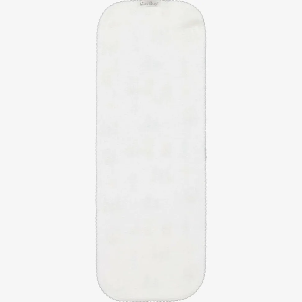 White burping cloth for baby boys and girls by Kissy Kissy, made in super soft and stretchy Pima cotton jersey. In shades of red, blue and beige, the London-themed print features iconic symbols and landmarks in the city. It has a cute, grey picot trim and an absorbent cotton towelling backing. It is ideal for placing over the shoulder when burping your baby after a feed.
