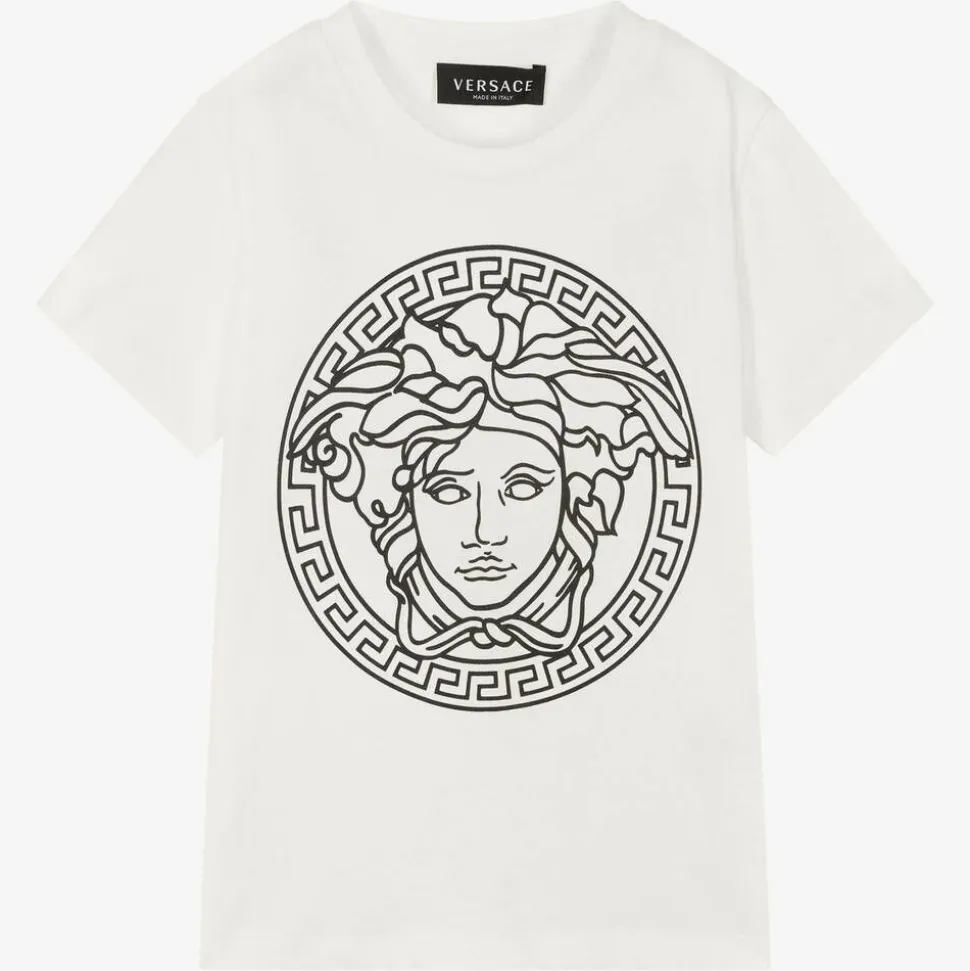 White T-shirt for boys and girls by luxury Italian brand Versace, made in soft cotton jersey. This classic crew neck style features the iconic Medusa logo print on the front for an eye-catching designer look.