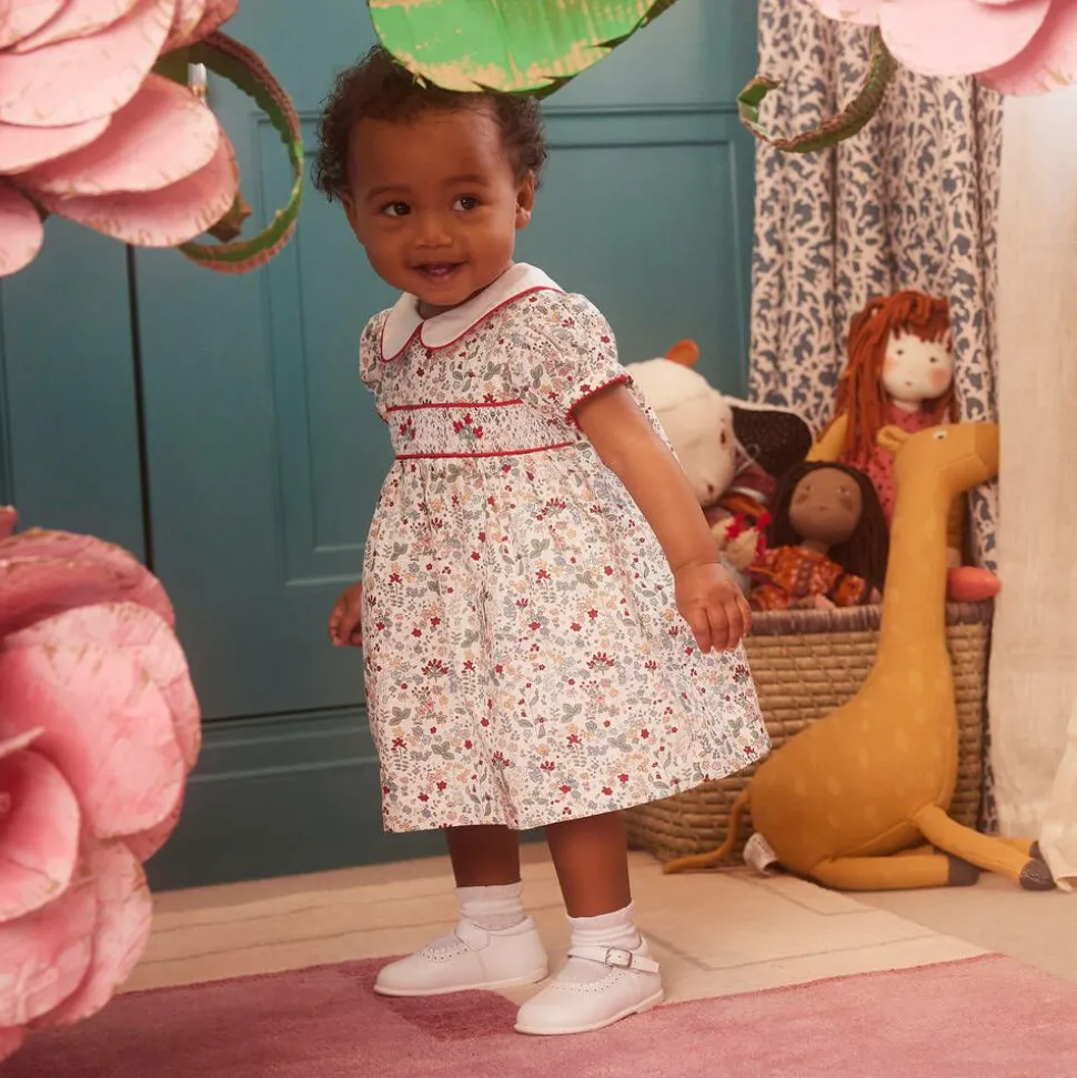Girls smart white patent leather shoes from Children's Classics, exclusive to Childrensalon. Made and lined in soft supple leather, this modern take on the classic Mary Jane style has a comfortable padded leather insole. They have lovely punch hole scalloped detail on the front and fasten with a buckle.