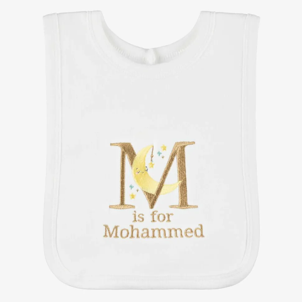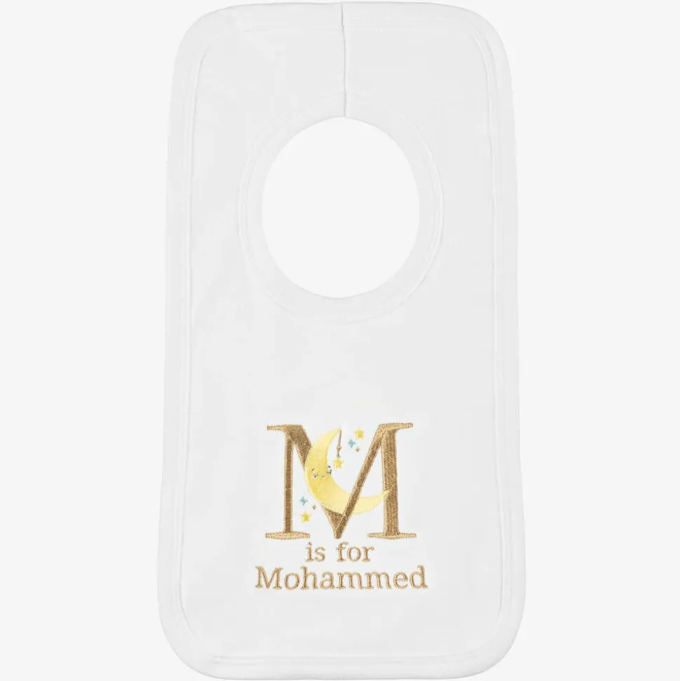 Cute white bib for baby boys and girls by Paint My Dreams, the British label. Made in soft cotton jersey for gentle comfort against delicate skin, this useful feeding accessory is ideal for catching small spills and dribble, and simply slips on over the head. Your little one's name can be embroidered below the 'M' initial and sweet moon motif, making a thoughtful gift.