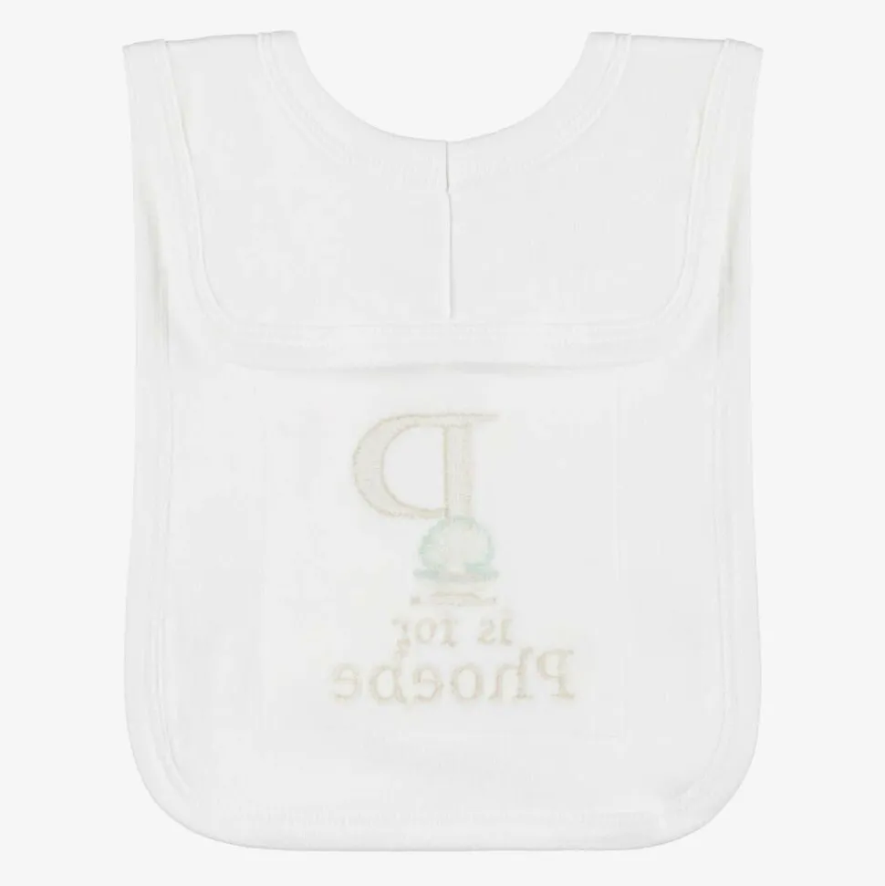 Cute white bib for baby boys and girls by Paint My Dreams, the British label. Made in soft cotton jersey for gentle comfort against delicate skin, this useful feeding accessory is ideal for catching small spills and dribble, and simply slips on over the head. Your little one's name can be embroidered below the 'P' initial and sweet glistening pearl motif, making a thoughtful gift.
