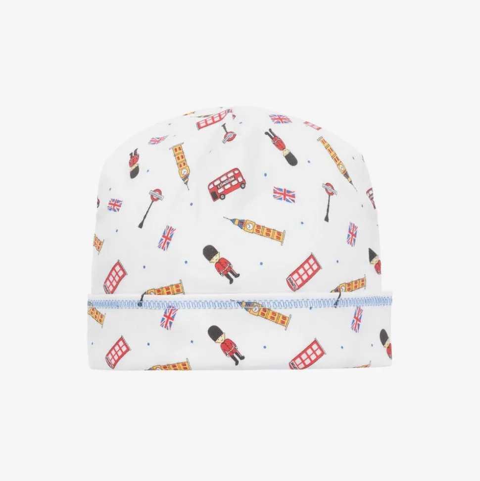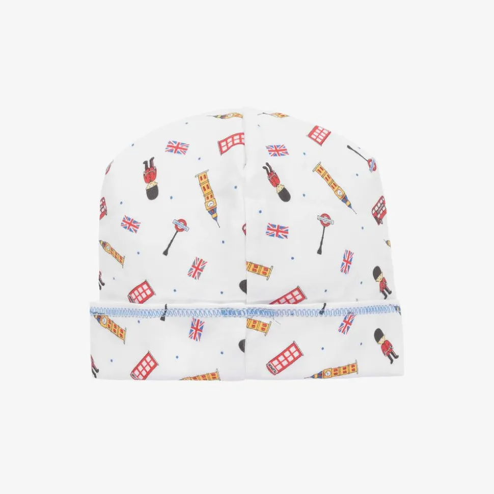 Lovely white hat for baby boys and girls from Magnolia Baby. Made in a double layer of soft Pima cotton jersey, it has an iconic London-themed print and a turned-up brim.