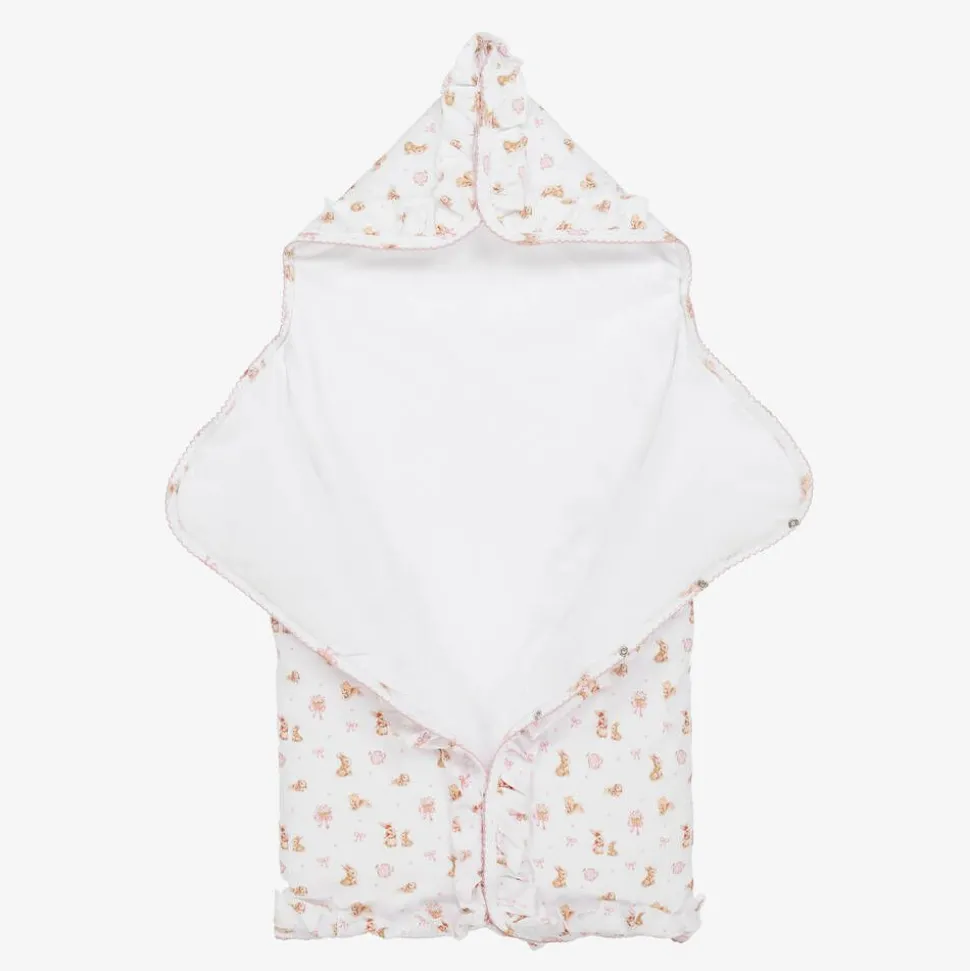 Patterned in an adorable pink and beige bunny print, this white nest for baby girls is by My Little Pie. It is decorated with pretty ruffles and picot embroidery detailing. Made in comfortable organic Supima cotton jersey, it is softly padded for warmth and has practical popper fastenings. The hood can be unfastened and laid out flat to act as a pillow for baby's head.