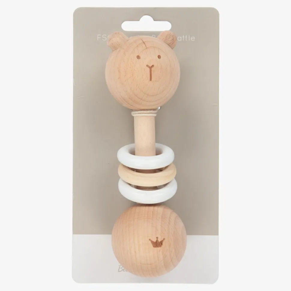 Made from sustainable FSC wood, a bear-shaped rattle for baby boys and girls from Dutch brand, Bam Bam. Ideal for little hands to hold, it has three moving rings.