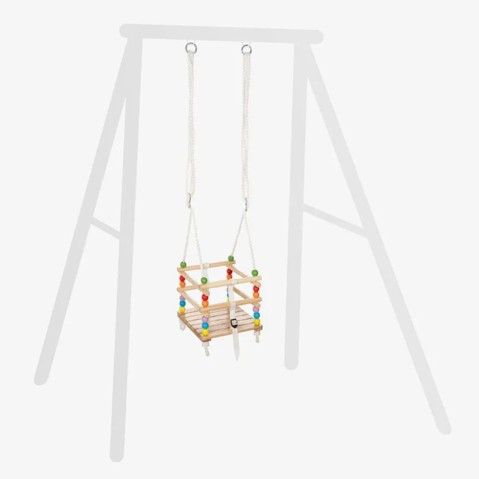 Lovely wooden cradle swing for little boys and girls by Bigjigs, great as an adventurous addition to the garden. Encouraging their love of the outdoors, your child can safely sit in the secured wooden seat, surrounded by brightly coloured beads. Supported by strong, adjustable rope ties, it can be attached to a frame for endless outdoor fun.