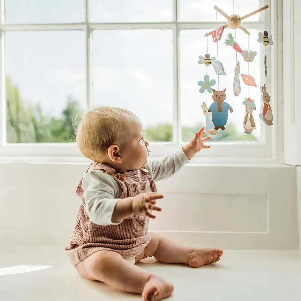 Decorate your little one's nursery with this adorable Peter Rabbit mobile by Orange Tree Toys, inspired by the charming Beatrix Potter tales. Ideal for engaging your baby's visual senses, it is painted in bright colours and has sweet Flopsy, Peter Rabbit and Benjamin Bunny character decorations.