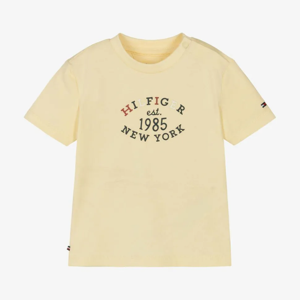 A pastel yellow T-shirt for baby boys and girls by Tommy Hilfiger, made in soft and stretchy cotton jersey for comfort. A branded look, it has a rubberised logo design on the front and the iconic flag embroidered on one sleeve. There are convenient popper fastenings on one shoulder to help with dressing.