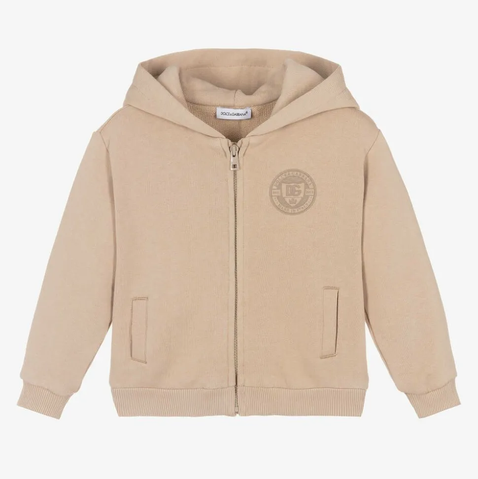Beige zip-up top for baby boys by luxury fashion designer Dolce & Gabbana, with faux pockets. In consideration of delicate skin, this long-sleeved layer is made in soft, mid-weight cotton jersey. The brand's crest-style DG logo features on the front in tonal print, adding that all-important designer touch. The smooth front zip is engraved with branding and the hood is lined.