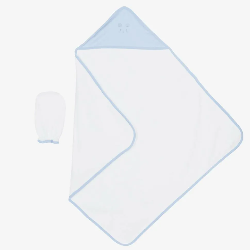 White cotton hooded towel and mitt set for baby boys by Kissy Kissy. Made in beautifully soft towelling, it has a pale blue Pima jersey hood with an embroidered bear face, and matching trims. Ideal for bath time, it comes with a soft mitt that has an elasticated cuff.