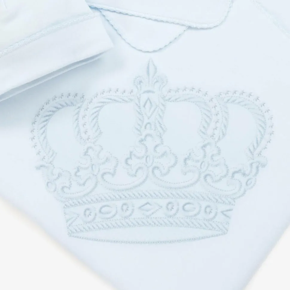 A lovely light blue blanket and hat gift set for baby boys from Sofija, made in beautifully soft cotton jersey. Both pieces have delicate embroidered trim and the blanket has a lovely tonal crown print in one corner. A versatile nursery accessory, the blanket is ideal as a cosy layer, a soft surface for tummy time or for wrapping around baby.