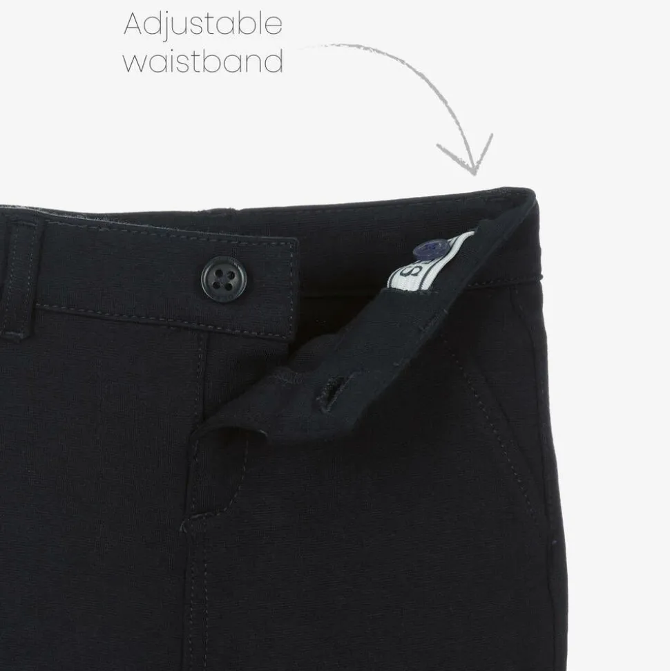 A smart navy blue waistcoat suit for baby boys by Guess, detailed with logo embroidery. The waistcoat and trousers are made in comfortable Milano jersey, with faux pockets and button fastenings. The trousers have an adjustable waist for an ideal fit. The white cotton shirt has a sweet dot pattern, and the long sleeves can be turned up and secured with a button tab. A fixed bow tie at the neck adds an elegant finishing touch.