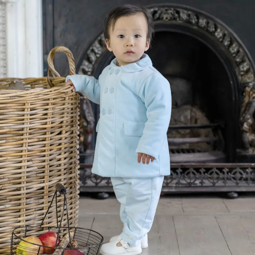Lovely pale blue coat for baby boys by Emile et Rose, made in super soft cotton velour. It has a traditional double breasted style and faux front pockets. Lightly padded, it is lined with soft jersey for comfort.