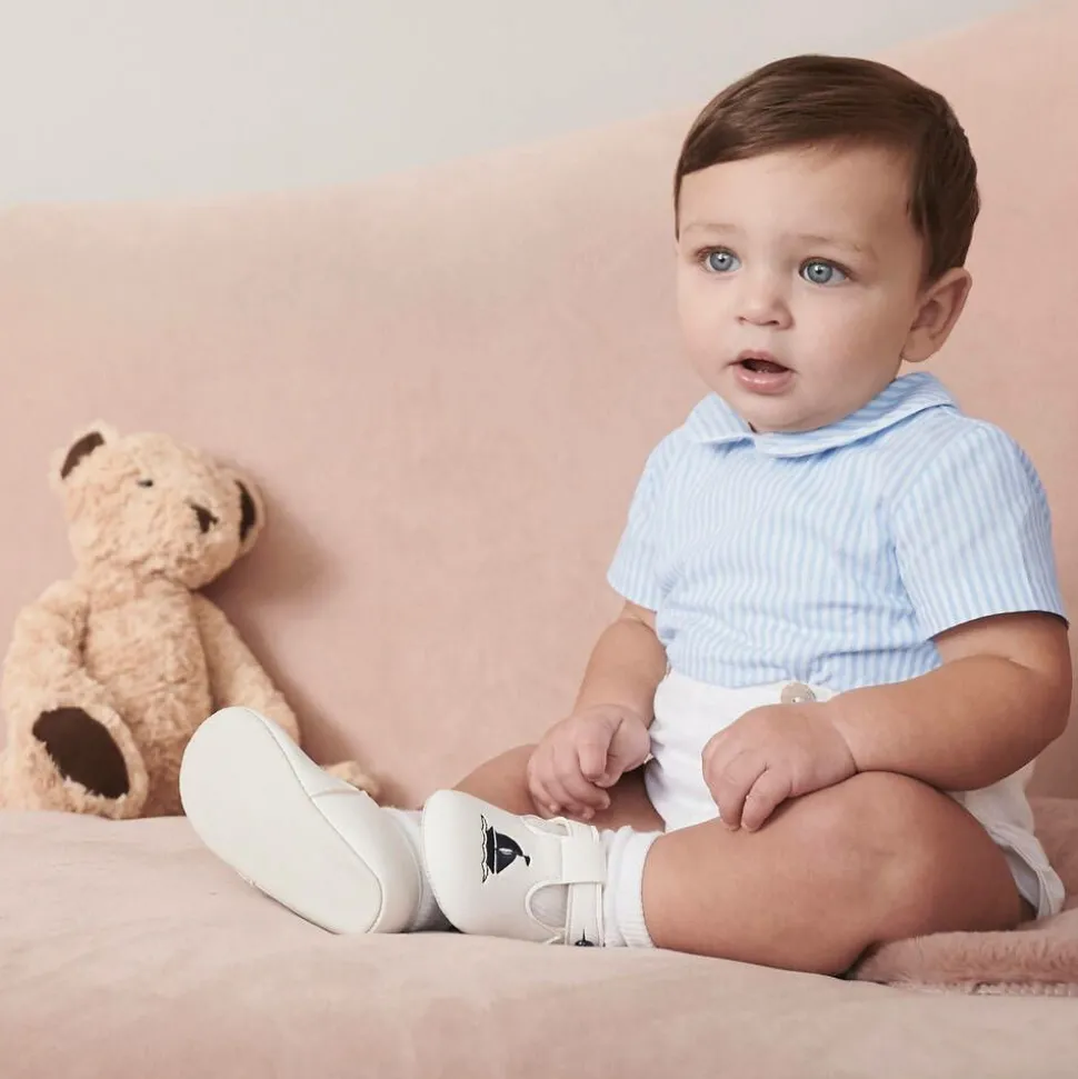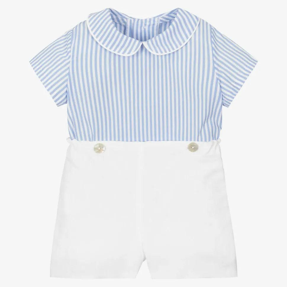 A smart, blue and white cotton short set for baby boys by Ancar. The lightweight shirt has a blue striped pattern, Peter Pan collar and fastens at the back with buttons. It attaches neatly to the shorts with buttons. The white linen blend shorts are fully lined and have a comfortable partially elasticated waistband.