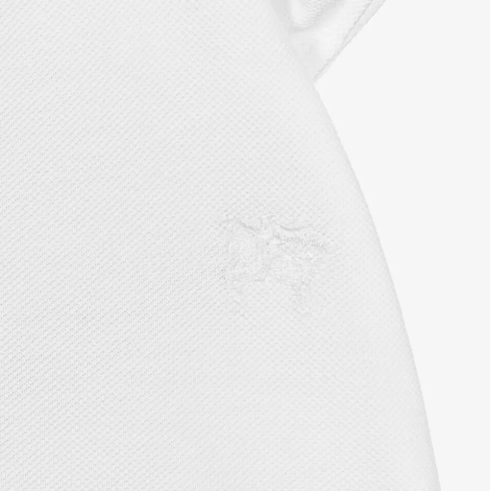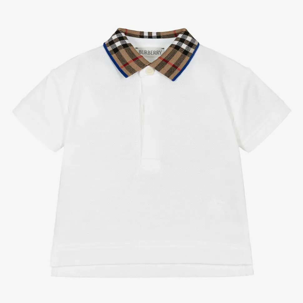 White polo shirt for baby boys by luxury British designer Burberry, made in soft cotton piqué. Instantly recognisable, this short-sleeved top features the label's iconic Burberry check collar with a signature Knight blue trim. It is embroidered with a tonal Equestrian Knight Design logo and has concealed button fastenings on the front. This item contains organic cotton.
