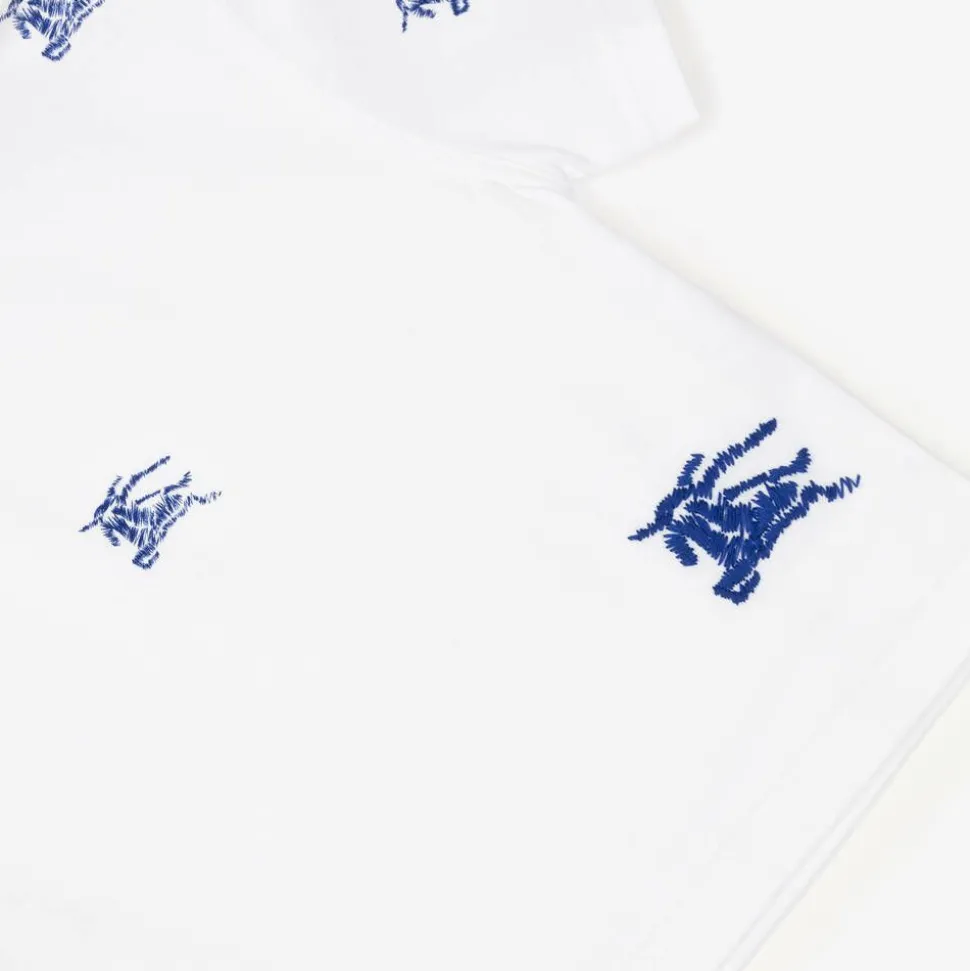 White organic cotton T-shirt for baby boys from British brand Burberry, made in soft jersey for a gentle feel against the skin. Adding a distinctive designer look, it is patterned with the label's scribble-effect Equestrian Knight Design in Knight blue, with a larger embroidered version above the hem. Popper fastenings on one shoulder allow for easy, over-the-head dressing.