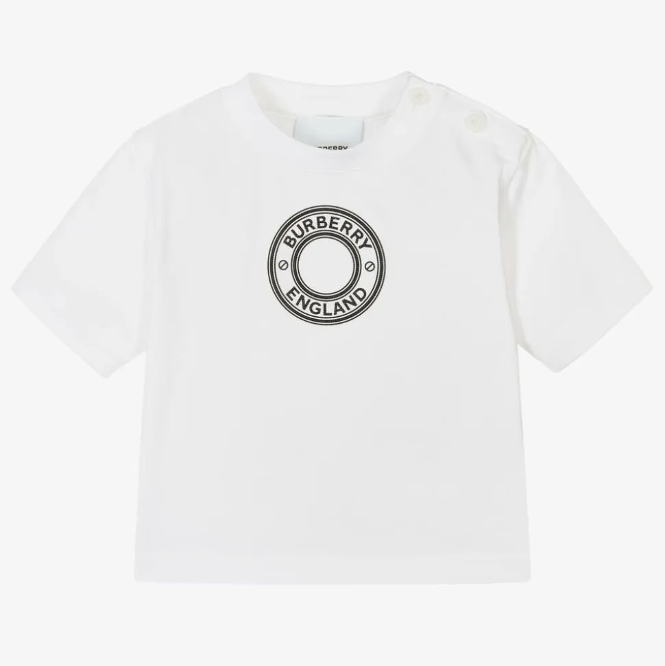 Baby boys classic white T-shirt by Burberry, made in soft organic cotton. The brand's stamp logo in black textured silicone adorns the front for a stylish designer statement. There are buttons on one shoulder to help with dressing.